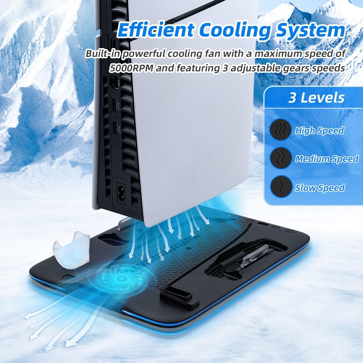 【Adjustable Cooling Fan System】The stand is equipped with a high-efficiency cooling fan system, featuring 3 adjustable gears (Low, Middle, High). The fan speed can ramp up to a maximum of 5000RPM, providing optimal cooling for your console and ensuring it runs smoothly, even during intense gaming marathons.