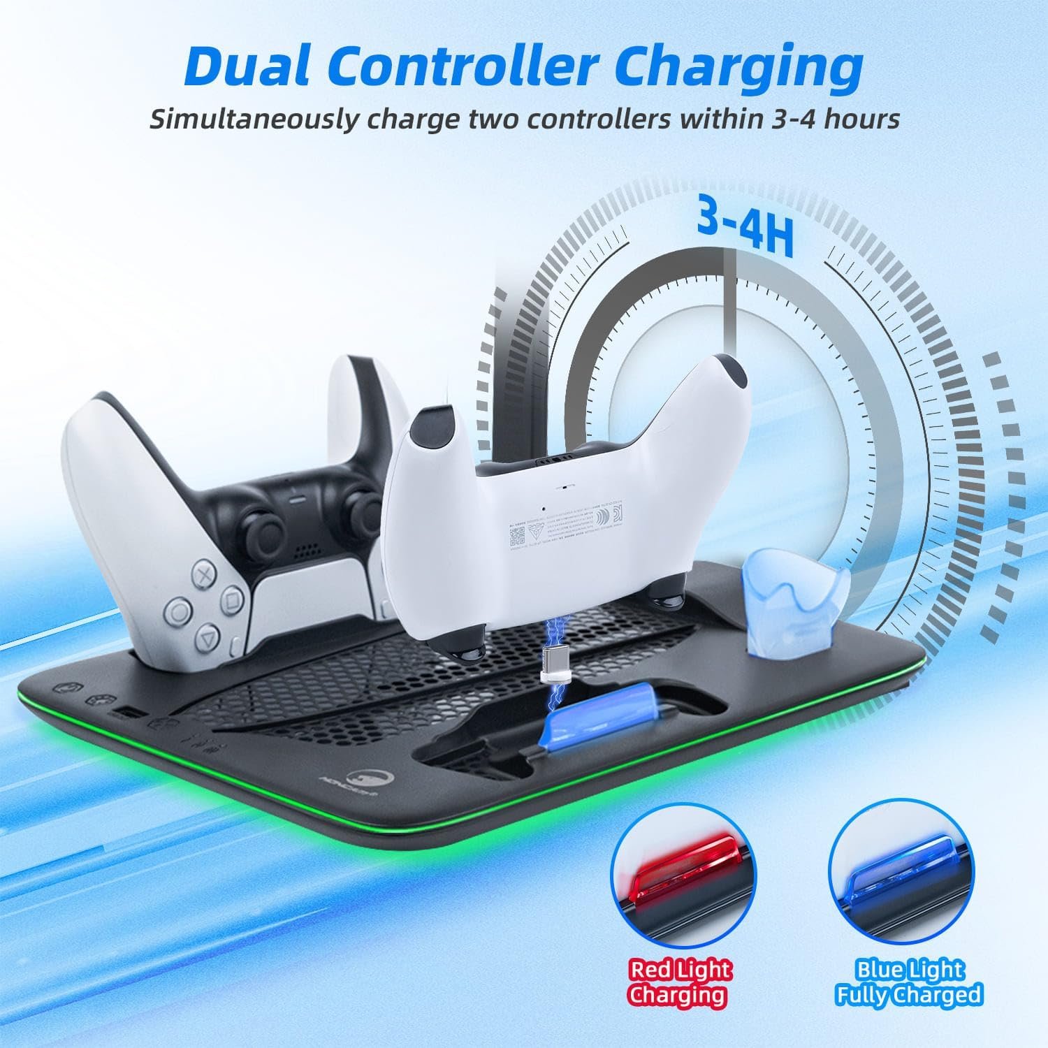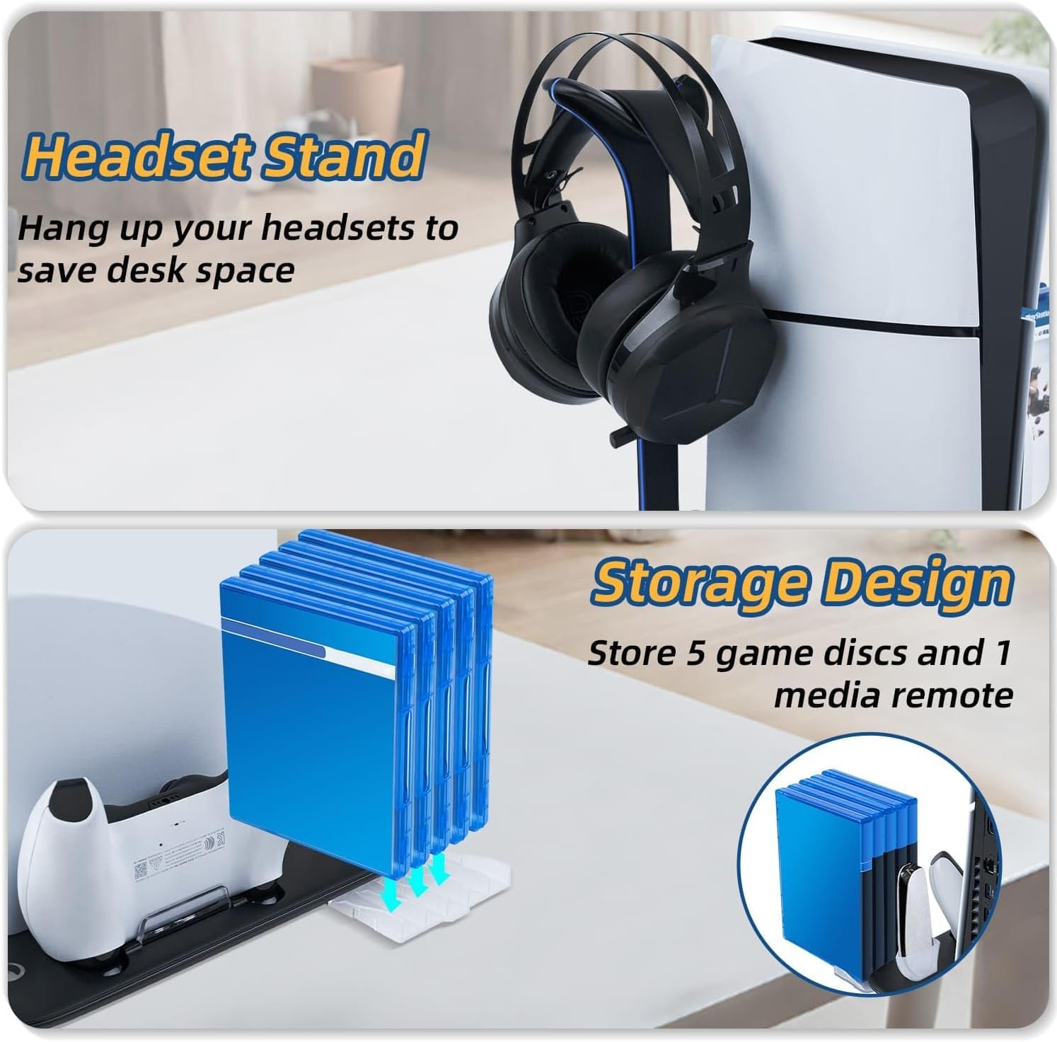 【Dual Controller Charging & Game Disc Storage】Efficiently charge two controllers simultaneously with an intuitive red light for charging and blue light for full charge indication. Compatible with the PS5 DualSense Edge controller, it guarantees a full charge within 3 hours. Additionally, the stand includes a storage solution for 5 game discs and a gaming headset, helping you keep your gaming area neat and organized.