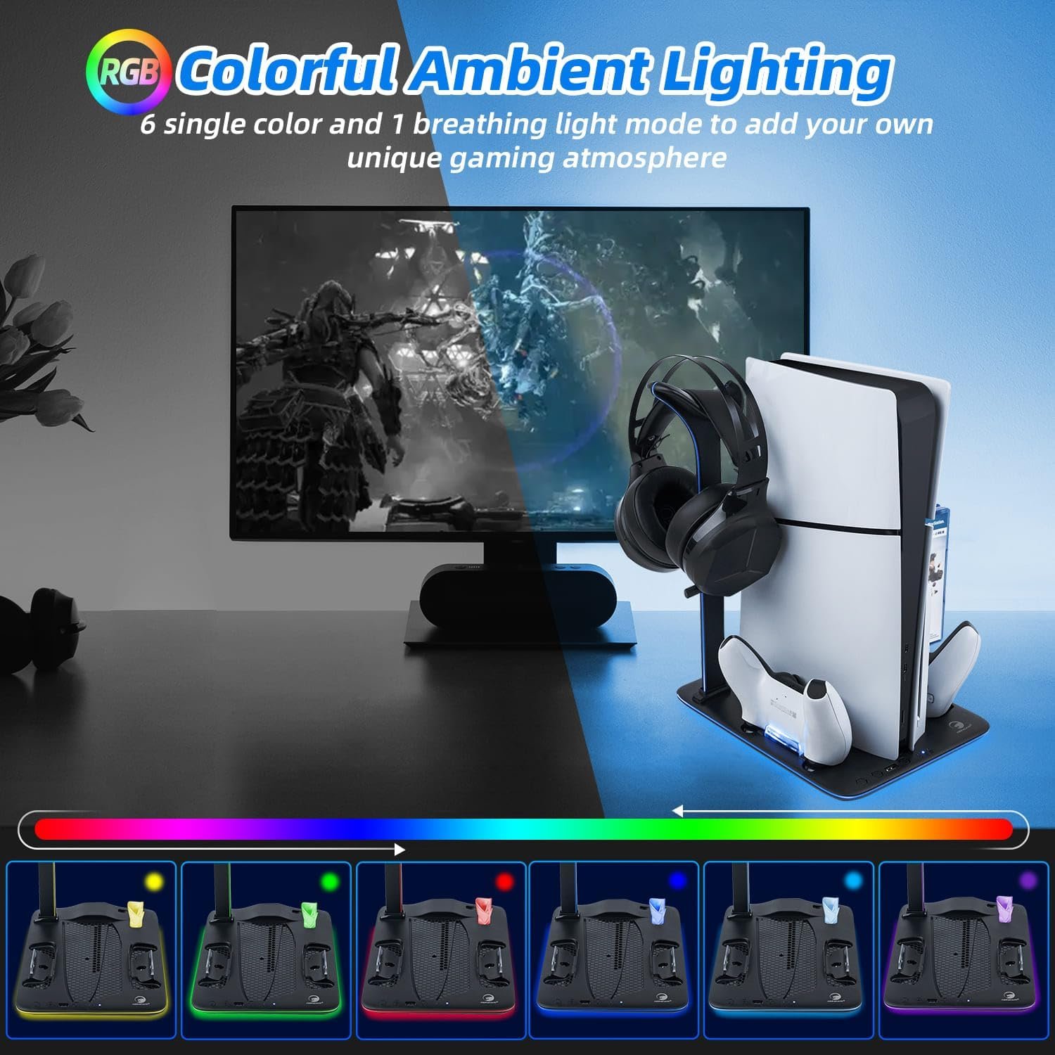 【Multi-Functional with Atmospheric Lighting】Elevate your gaming ambiance with the stand’s atmospheric lighting feature. It comes with 6 single color options (Red, Blue, Green, Yellow, Pink, White) and an enchanting breathing rainbow light mode. This feature adds a mesmerizing glow to your gaming area, creating the perfect mood for long gaming sessions.