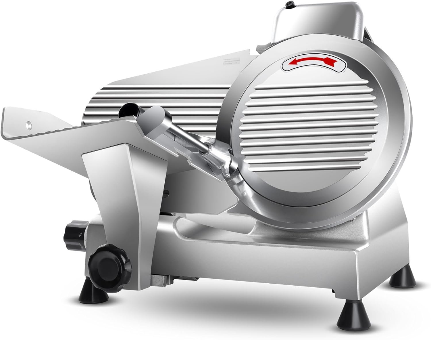 【Premium Material Construction】This meat slicer is constructed with a cast aluminum body, rust-proof, corrosion-proof, and easy to clean. The 10-inch diameter chromium-plated steel blade with a sharp edge is designed for quick slicing.Input Power: 240W; Output Power: 150W. Our slicer machine is equipped with all-copper motor, which allows you to produce 50 pieces of food per minute.
