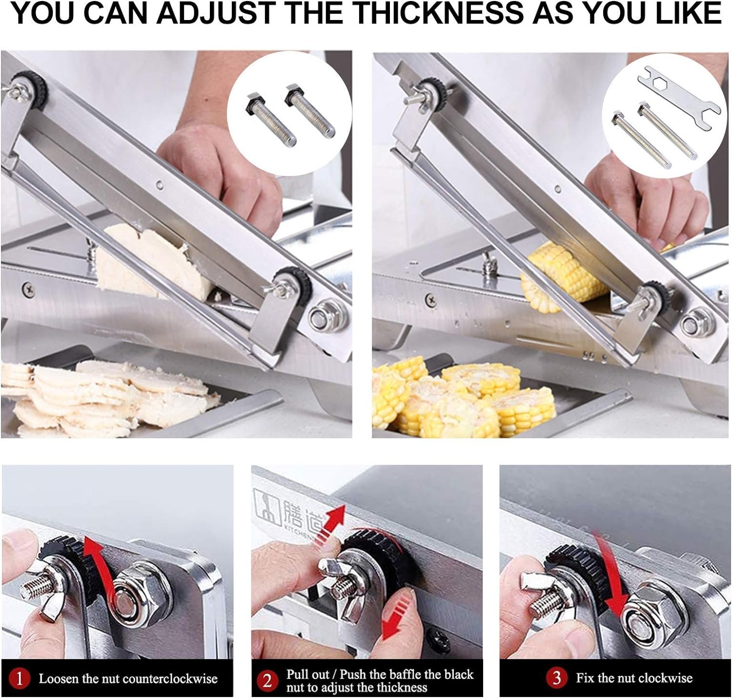 【Thickness Control】Slice Thickness Adjustable from 0.1mm to 10mm (with Short Screws), from 0.1mm to 60mm (with Long Screws)】 How to Adjust the Slice Thickness: 1. Loosen the nut for thickness adjustment Counterclockwise; 2. Pull out / Push the baffle, Turn the Black nut to adjust thickness; 3. Fix the nut Clockwise.You can choose the most proper slice thickness for different kinds of ingredients.
