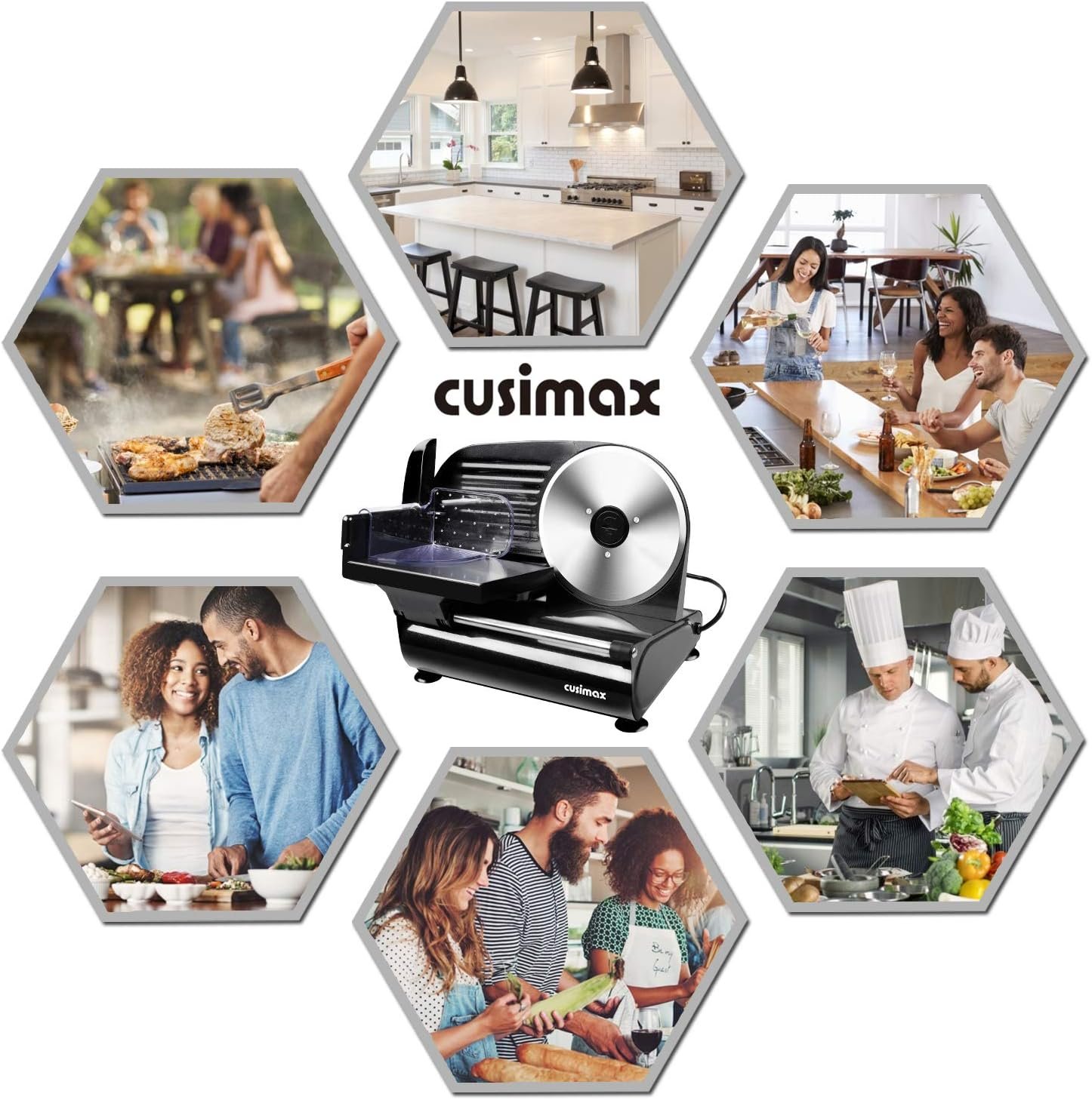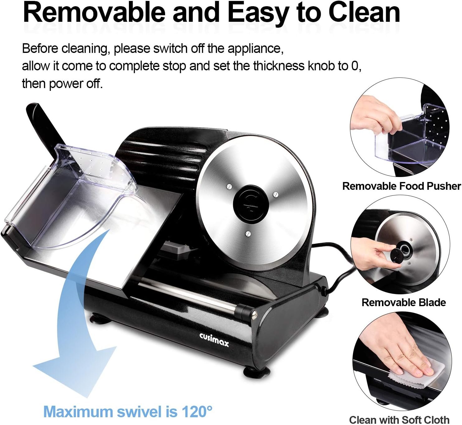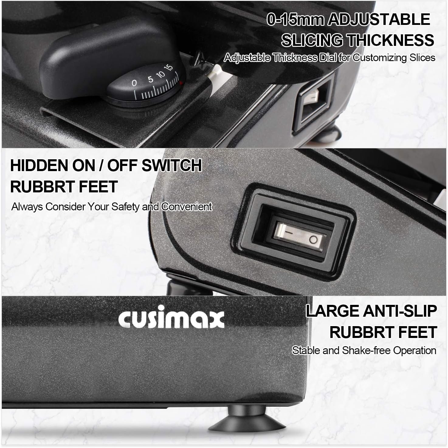 Easy Clean & Safe:CUSIMAX meat slicer for home never worry about how to clean up the food hidden in it. Hidden track design and removable blade make it easy to clean the food slicer machine. The 4 pieces of silicone anti-skid sucking pads, fasten the machine, and safe to work.