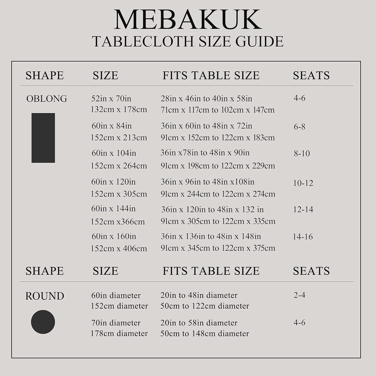 Tablecloth Length = Table Length + 8″~16″(20~40 cm)Tablecloth Width = Table Width + 8″~16″(20~40 cm) Tips
