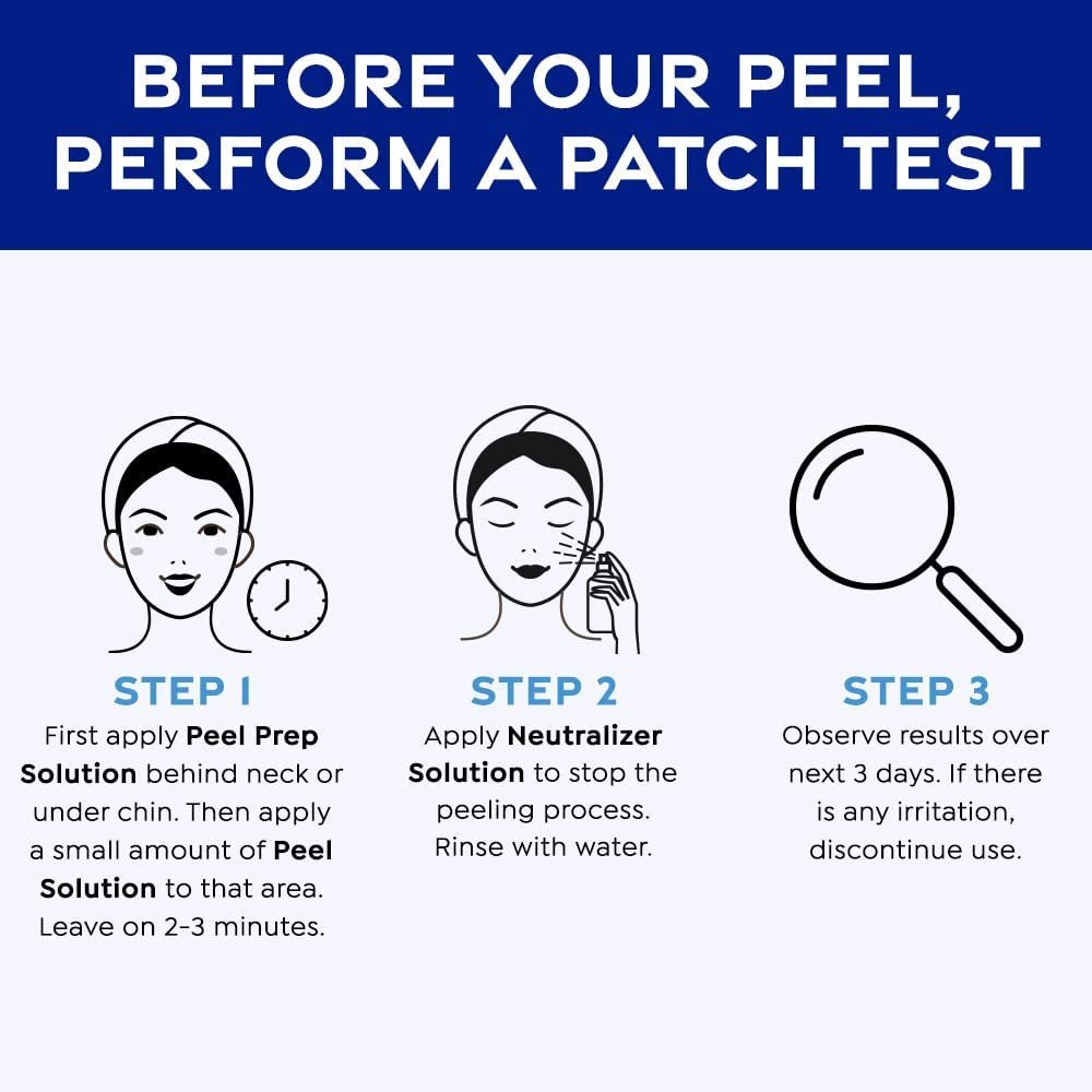WARNING/PATCH TEST: We strongly recommend that you conduct a patch test 3 days prior to your peel; Apply as you would the 3 step process to small area behind ear or under chin; Observe skin’s reaction over 3 days; Read instructions carefully
