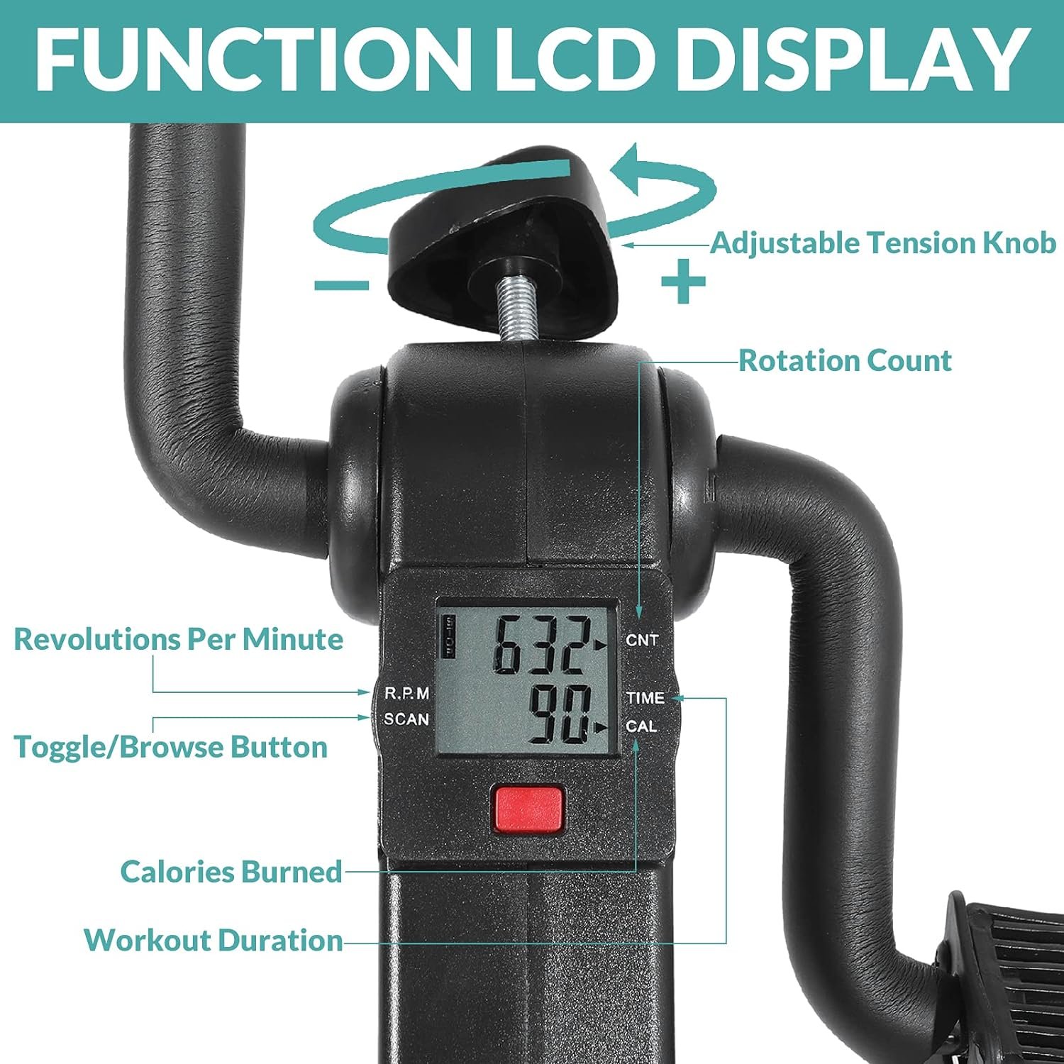 LED MONITOR: Pedal exerciser for seniors is equipped with a LCD monitor that can show time, count, calories burned and RPM. Short press the red button to switch these data or long press the red button to reset the monitor. And it automatically shuts off after 4 minutes of inactivity