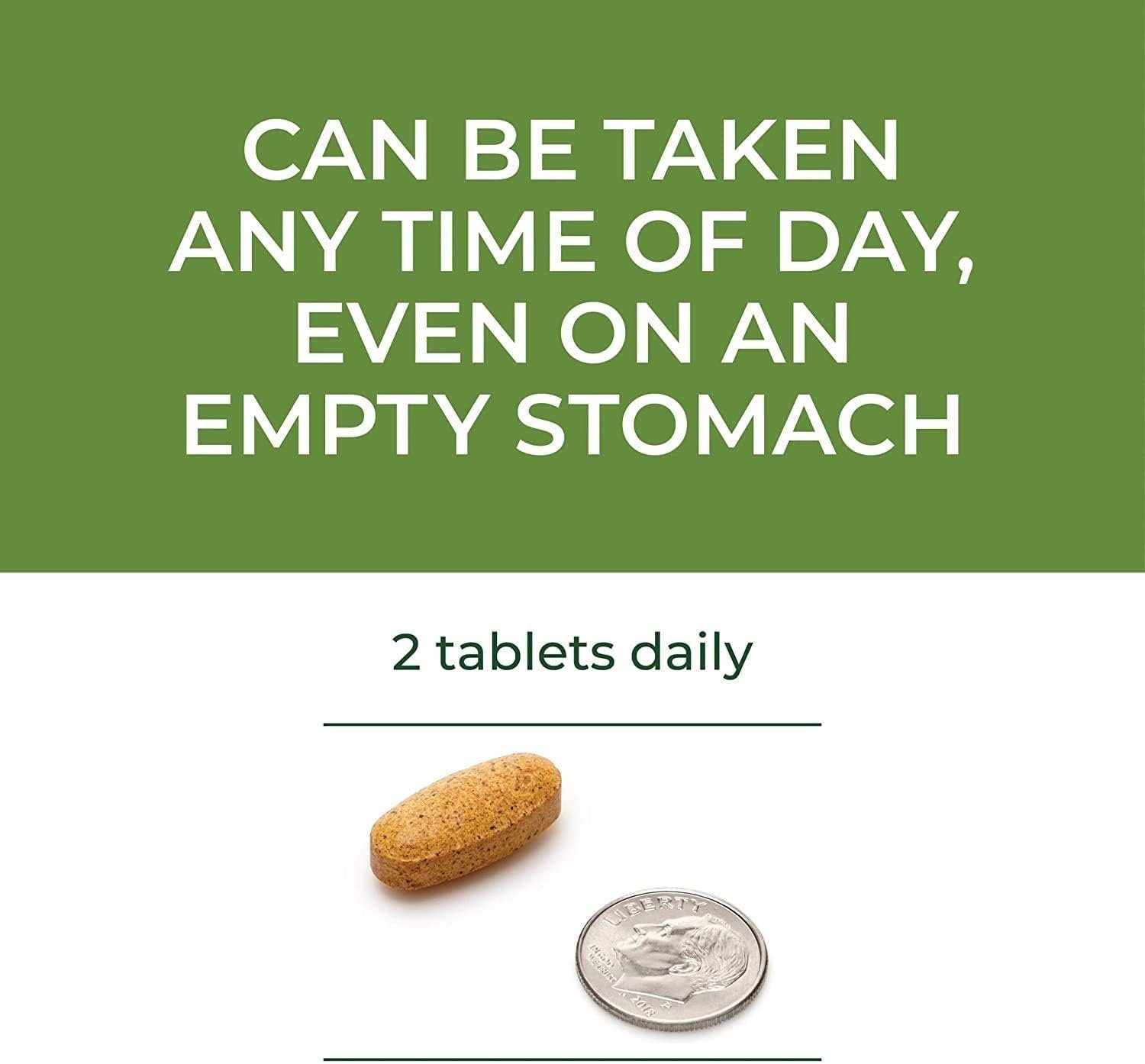 Can be taken any time of day, even on an empty stomach. 2 tablets daily