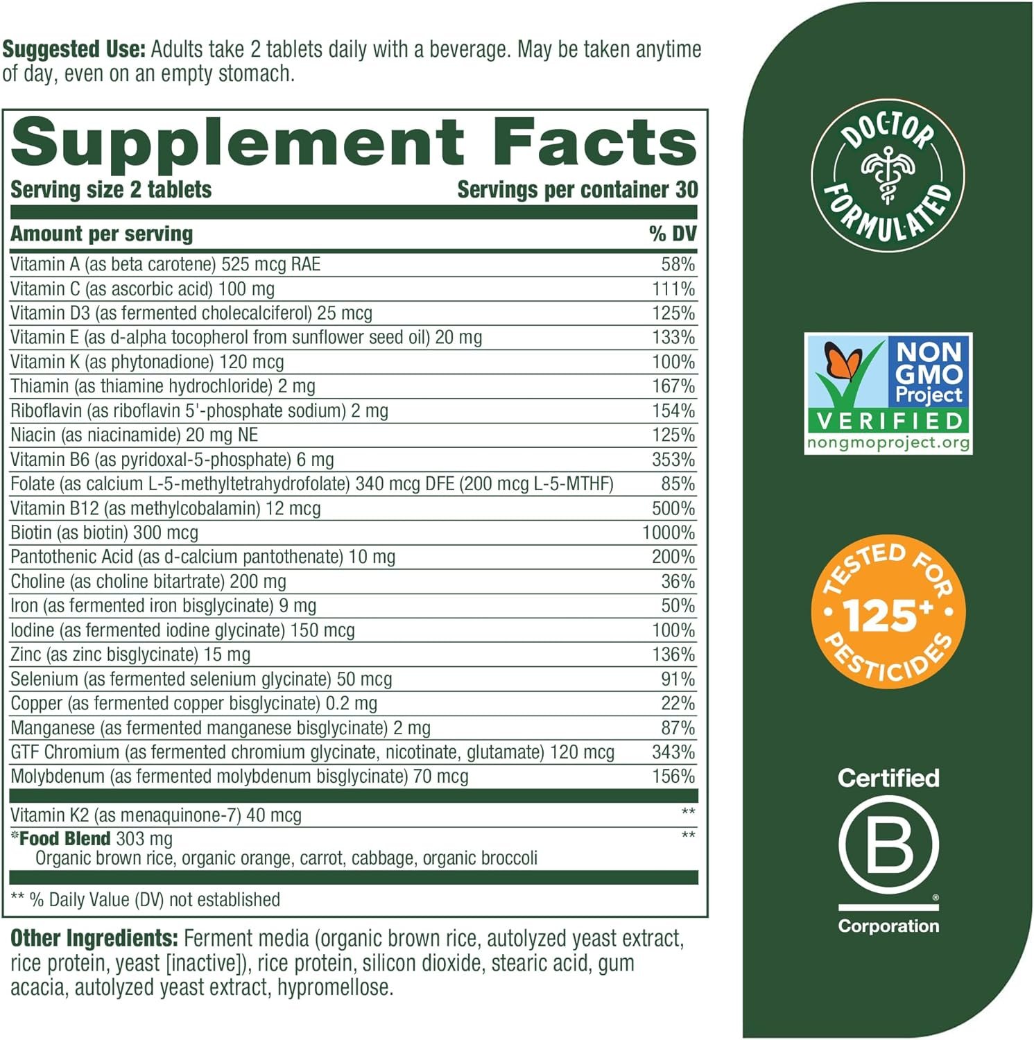 Non-GMO, Vegetarian; Tested for over 125 chemical substances; Made without 9 allergens: milk, eggs, peanuts, tree nuts, soy, wheat, fish, shellfish, and sesame; Gluten-Free
