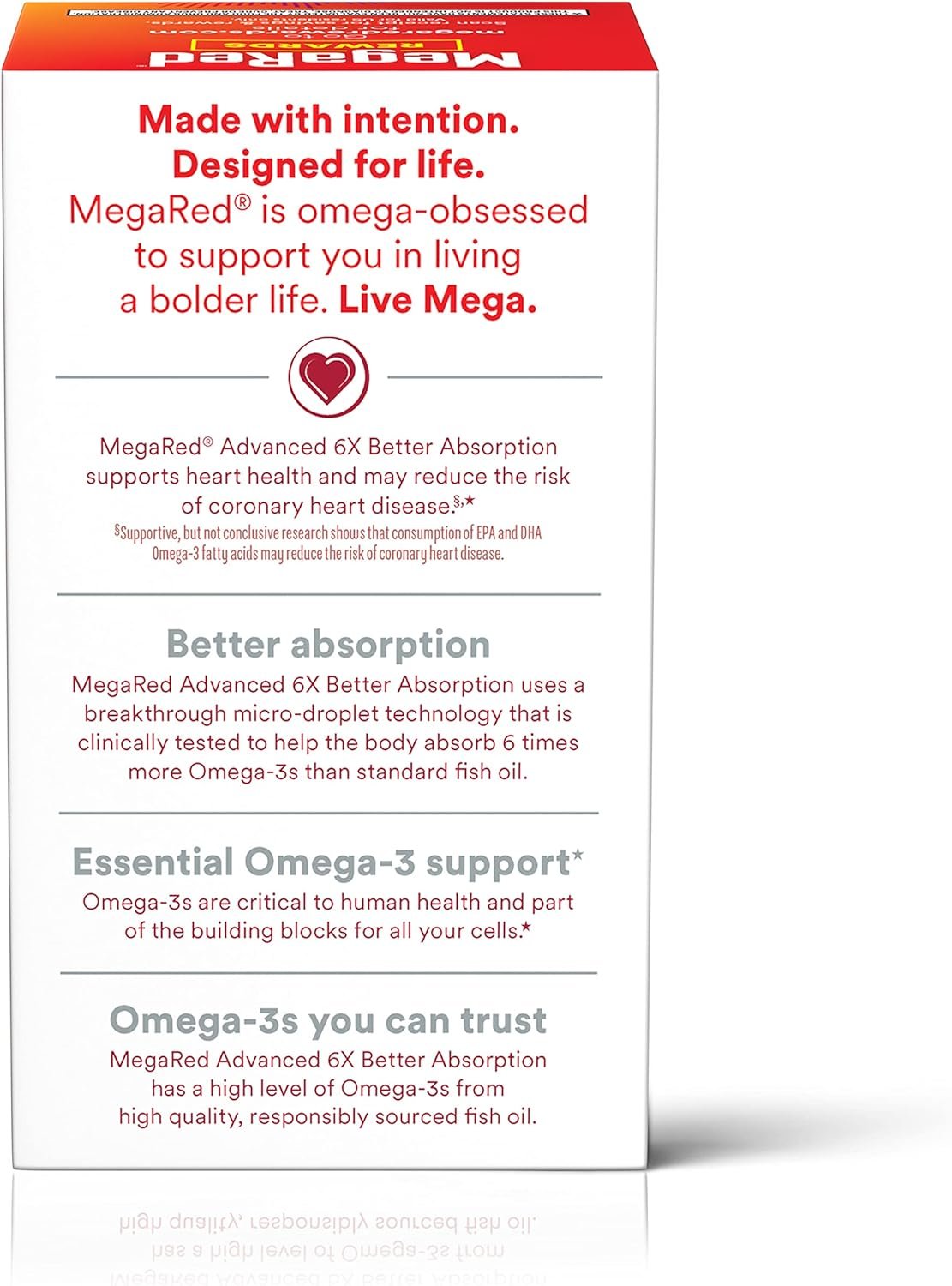 HIGH QUALITY FISH OIL: MegaRed Advanced 6x has a 1600mg proprietary high quality & sustainable fish oil blend with patented micro-droplet technology. Micro-droplet technology has been clinically proven to help the body absorb 6x more Omega-3s vs standard fish oil pills. Which means your body can absorb more nutrients, faster.