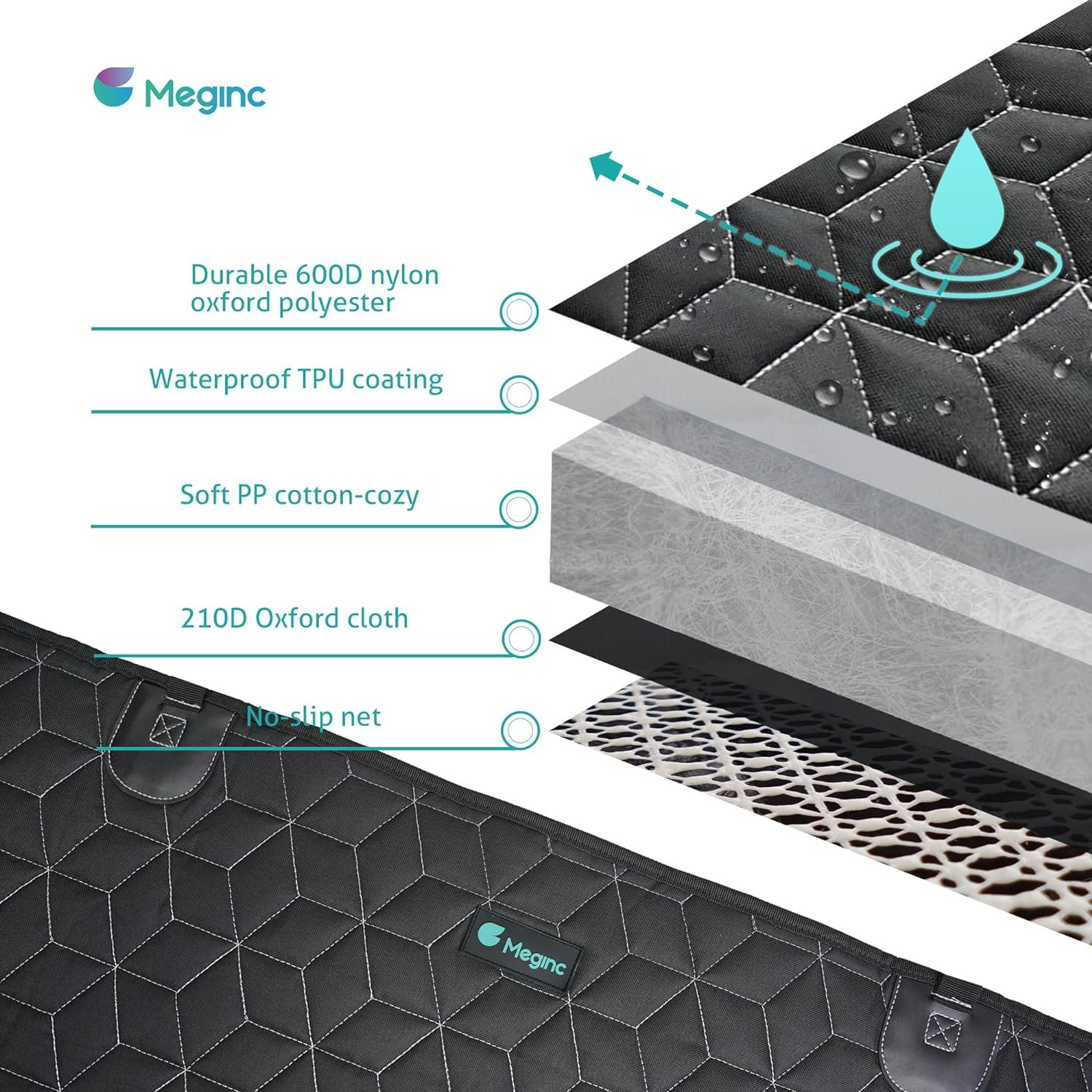 šćSTURDY MATERIALć: HEAVYDUTY! HEAVYDUTY! HEAVYDUTYļ¼Meginc dog back seat cover is made of 600D Oxford cloth, 100g soft PP cotton, 210D polyester fabric, 100% waterproof TPU and PVC anti-slip mesh. A thick pet seat cover can mitigate the damage of your vehicle and protect carpet, upholstery from unpleasantries such as dog hair, urine, or vomit, moreover our protectors also providing a familiar, comfortable and safety space for your pets during the road travel.
