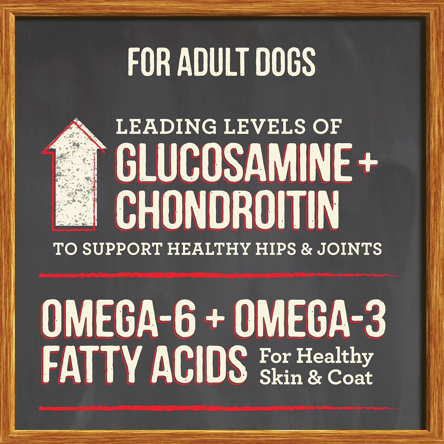 Premium beef kibble with ancient grains features leading levels of glucosamine and chondroitin for dogs, to provide hip and joint support in adult dogs