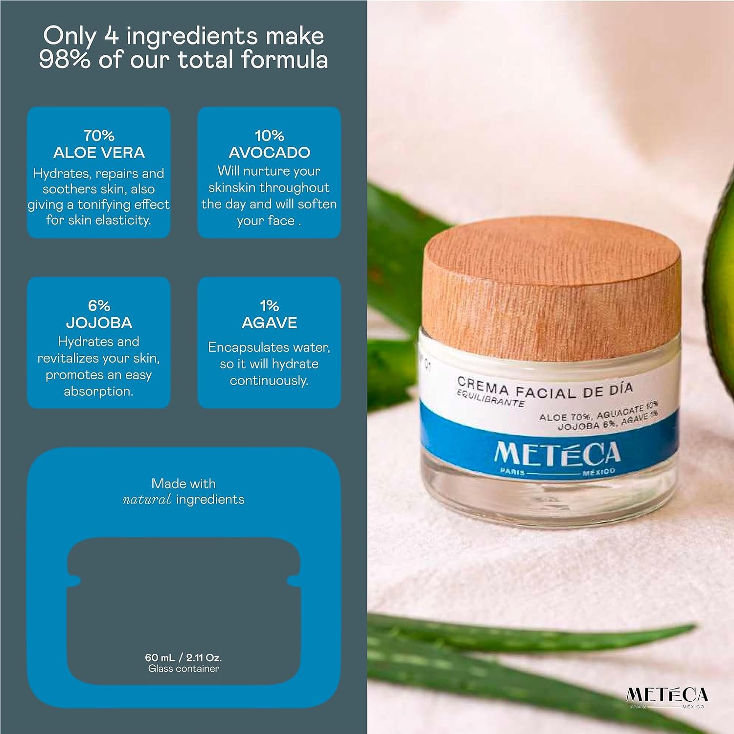 MAIN INGREDIENTS: | 70% Aloe Vera, Hydrates, repairs and soothers skin, giving also a tonifying effect for skin elasticity | 10% Avocado, Will nurture your skin throughout the day and will soften your face | 6% Jojoba, Hydrates and revitalizes your skin. Very similar to skin sebum, so it promotes an easy absorption | 1% Agave, encapsulates water, so it will hydrate continuously your skin.