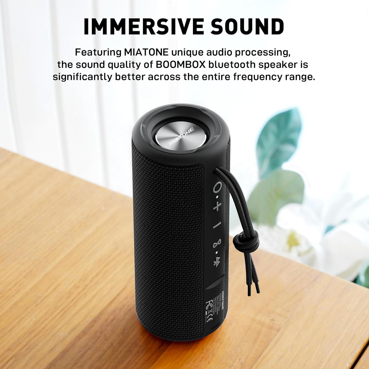 [Immersive Sound] The MIATONE audio processing makes the audio quality of the BOOMBOX bluetooth speaker better across all the frequency range from dual precision acoustic stereo drivers. Further, the crisp treble and mid frequencies are without noticeable crackle at maximum volume. Also, using the DSP technology, the dual advanced subwoofers and aluminum passive radiators on each ends boost deep and precise bass that is true to your music, without exaggeration and distortion.