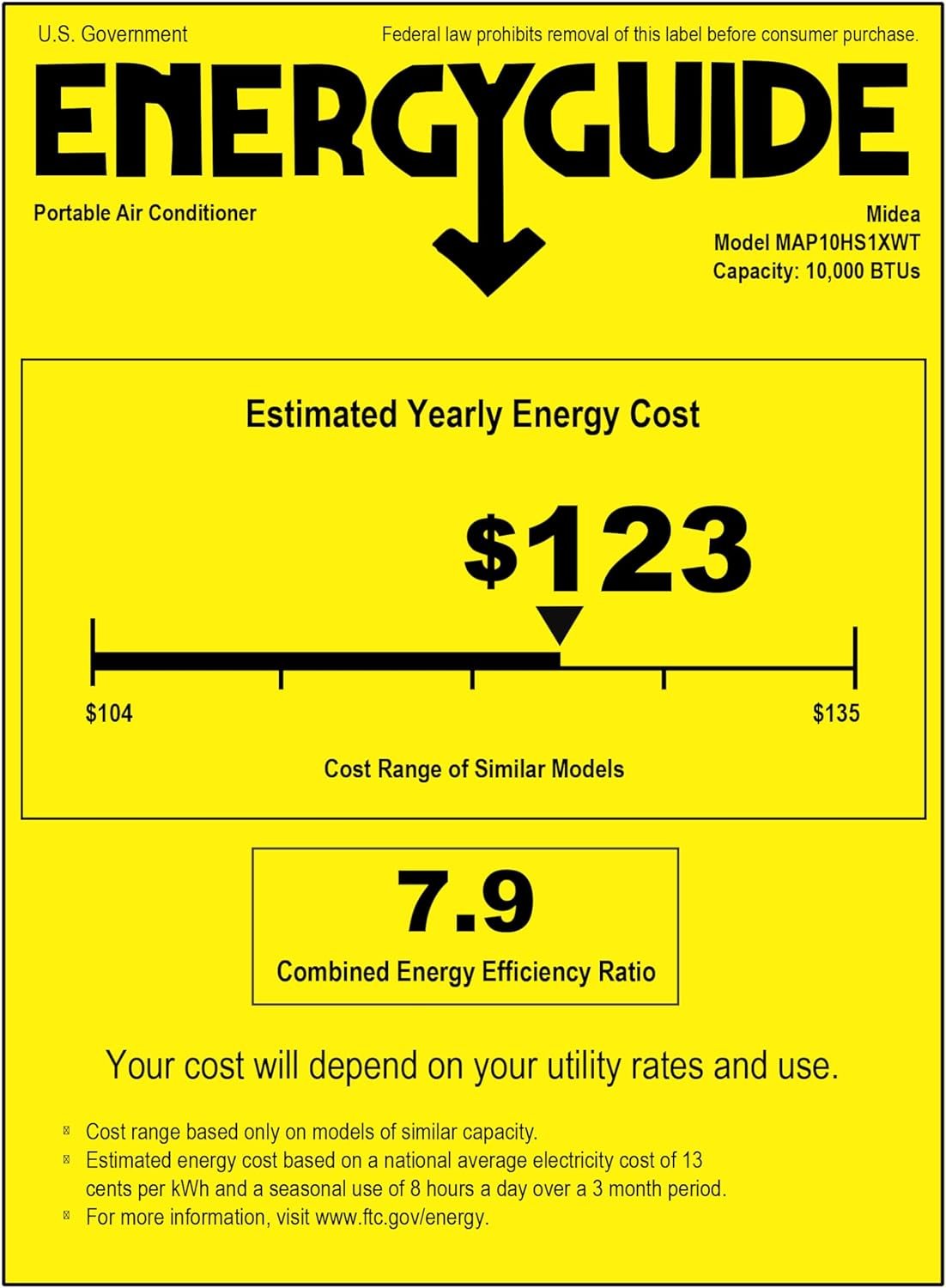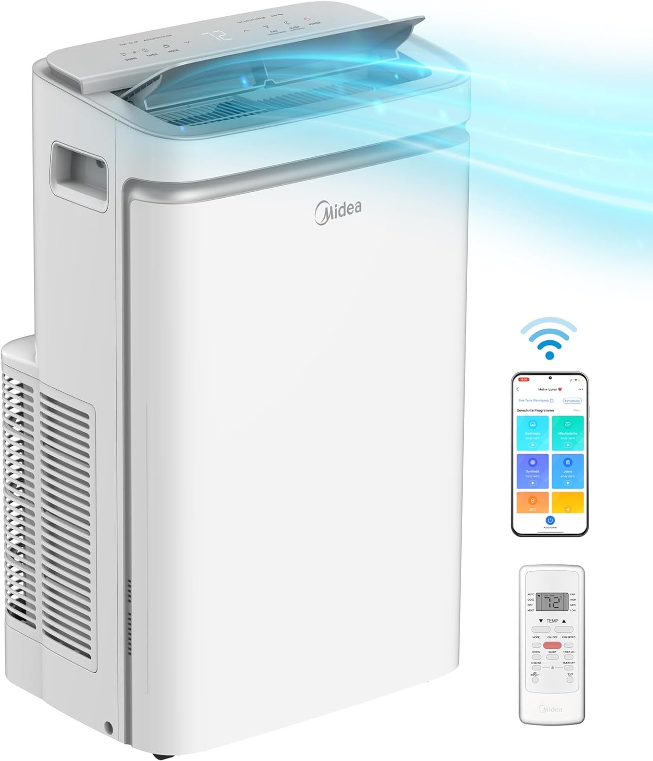 SMARTCOOL – Midea 14,000 BTU ASHRAE (10,000 BTU SACC) Portable Air Conditioner delivers fast, effective cooling for spaces Up to 345 sq. ft. while providing fan and dehumidification functions in any home, creating a relaxing and comfortable environment