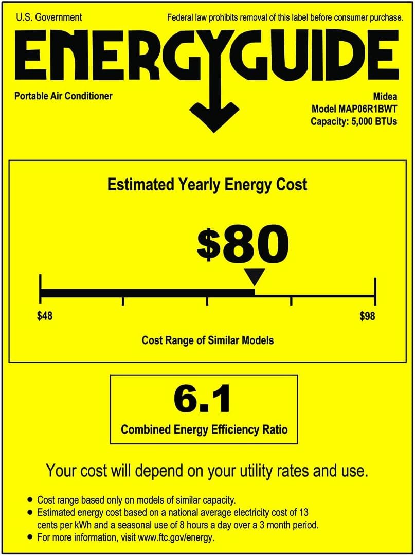 Midea 6,000 BTU DOE (5,000 BTU SACC) Portable Air Conditioner, Cools up to 150 sq. ft., Works as Dehumidifier&Fan, Remote Control&Window Kit Included3 IN 1 COMFORTMidea’s Portable AC unit with 6,000 BTU Cooling has three modes to help your house, apartment, or room be as comfortable as possible. It can cool a space, circulate air with its 3-speed fan, or reduce humidity utilizing the dehumidifier mode.QUIET & POWERFULThis portable AC unit can cool a room up to 150 sq. ft. and is ultra quiet. Even while on high it is quieter than a household refrigerator. It even has a Sleep mode that decreases the noise level even further while you rest so you can have a peaceful night.EASY TO USE & CLEANThe portable AC unit features an LED display and includes a compact remote control (batteries included) to set the time, temperature, and mode from across the room. The 24-hour adjustable timer can cool a room to a temperature between 62°F-86°F. There is also a removable and reusable air filter.EASY INSTALLATION Roll your air conditioner to the preferred cooling area, attach the 5ft hose and adjustable window brackets (fits openings from 19.4″- 62.2″), turn the AC unit on, and let the cooling begin! An exhaust hose and window kit are included, no extra tools are needed for assembly. Installation instructions are simple and each unit comes with a 1 Year Parts & Labor Warranty.WarrantyMidea is the world’s largest provider of air conditioning products. As a testament to our dedication to quality, we offer a one year parts and labor on this product.