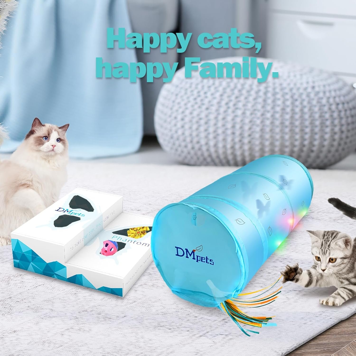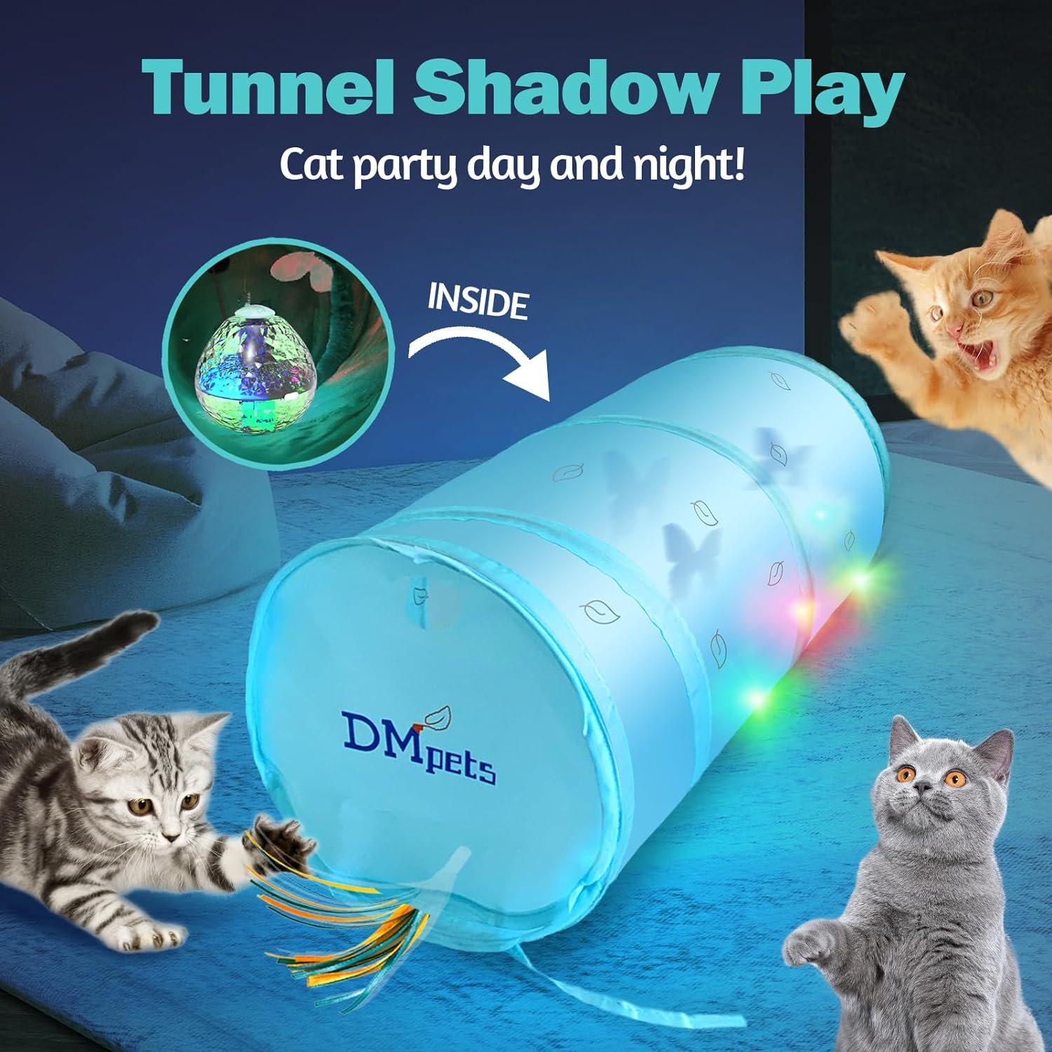 Tunnel Shadow Play: irregular moving feather, butterfly, fish project on the tunnel like shadow puppets, Make cats kittens great enjoyment by busy chasing, pounce,hunting Colorful shadow or fish out from holes of closed tunnel