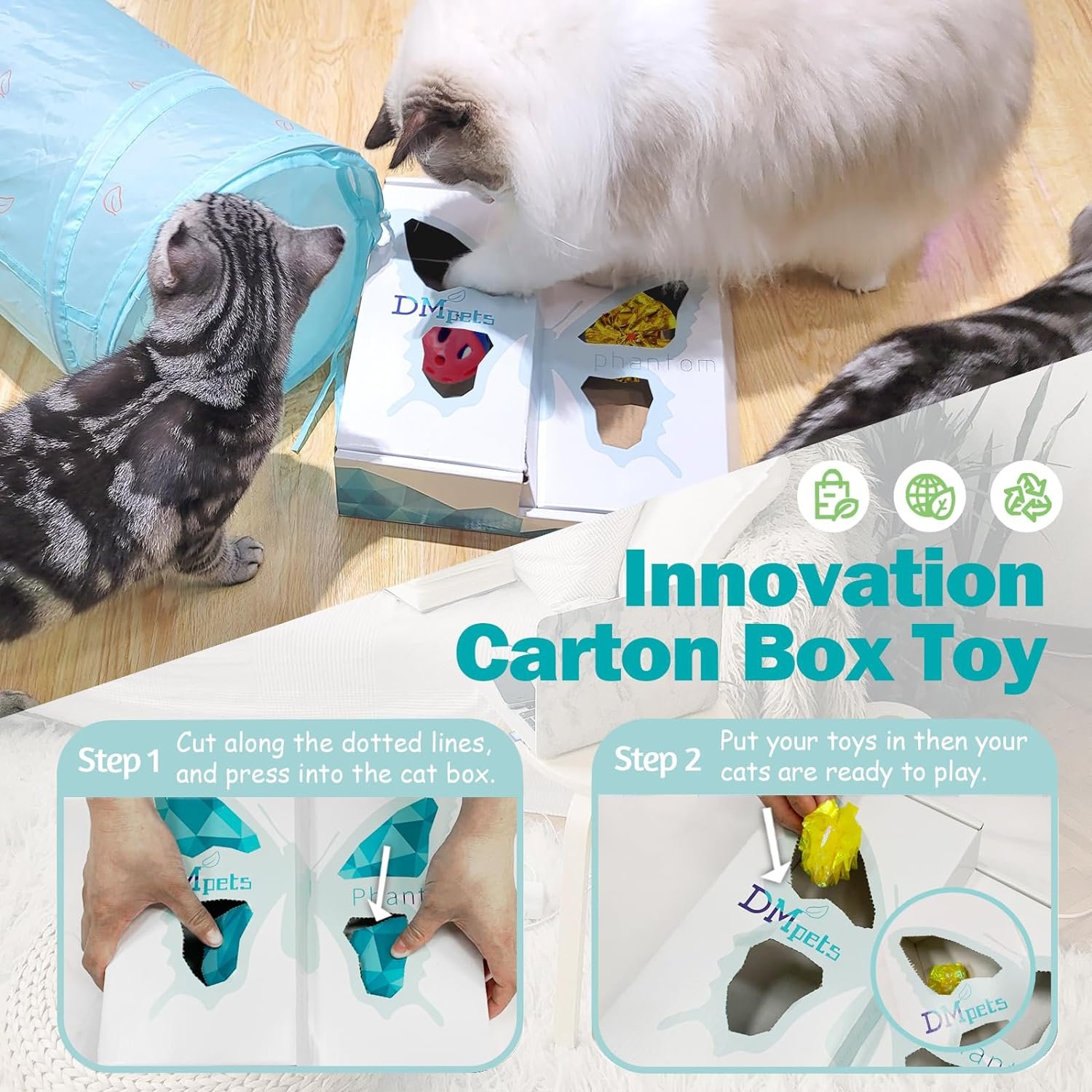 Innovation Cat Box Toy: Cat kitten always crazy to fish out the bell ball, crinkle ball from 4 holes on toy packing box. You could add more fun by puting cat’s snack in box