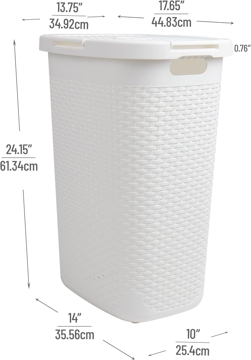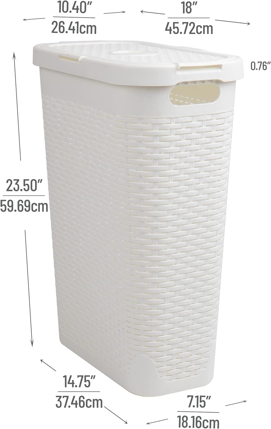 Space-saving and convenient portability with cut-out handles; 40L hamper dimensions 10.4 x 18 x 23.5 inches (26.16 x 45.72 x 59.69 cm) and 60L hamper dimensions 13.75 x 17.65 x 24.15 inches (34.92 x 44.83 x 61.34 cm)