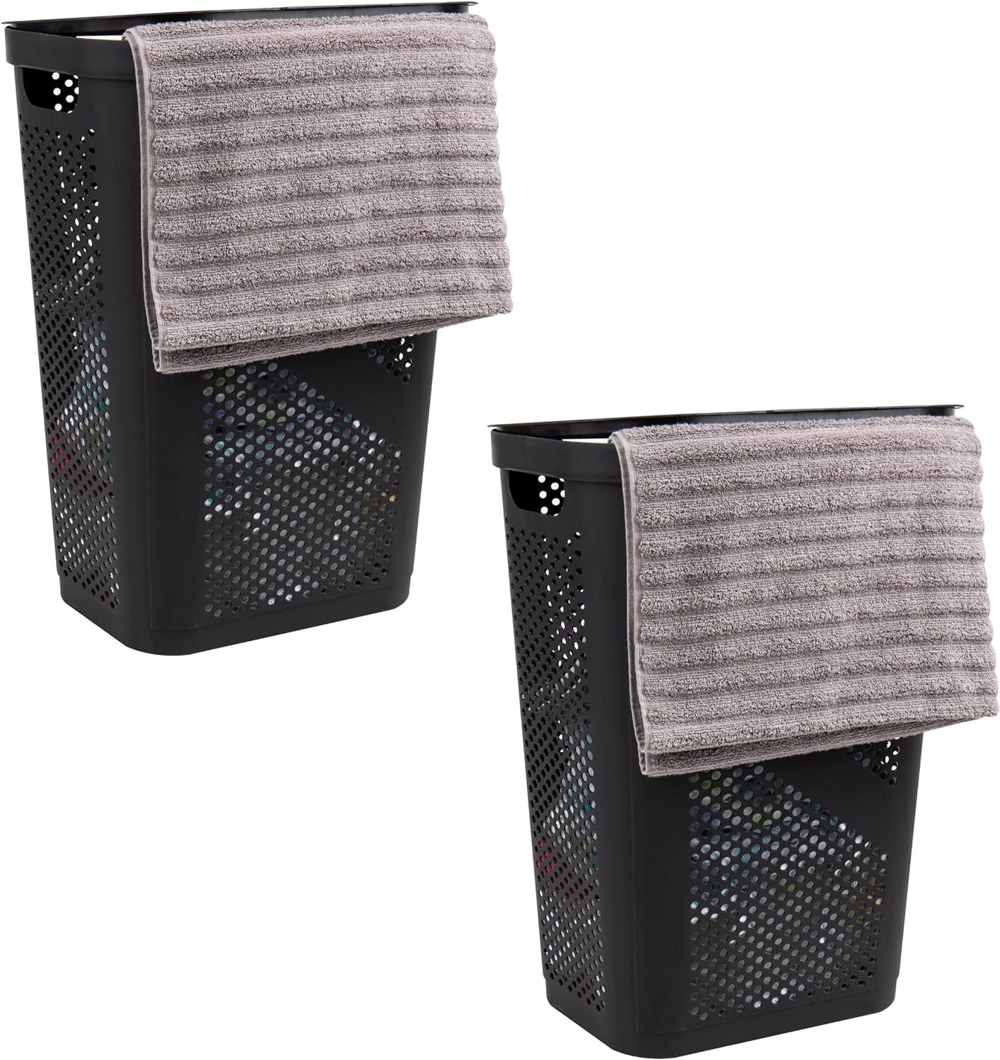 Mind Reader Basket Collection, Slim Laundry Hamper, 60 Liter (15g/33lbs) Capacity, Cut Out Handles, Attached Hinged Lid, Ventilated, Set of 2, Black