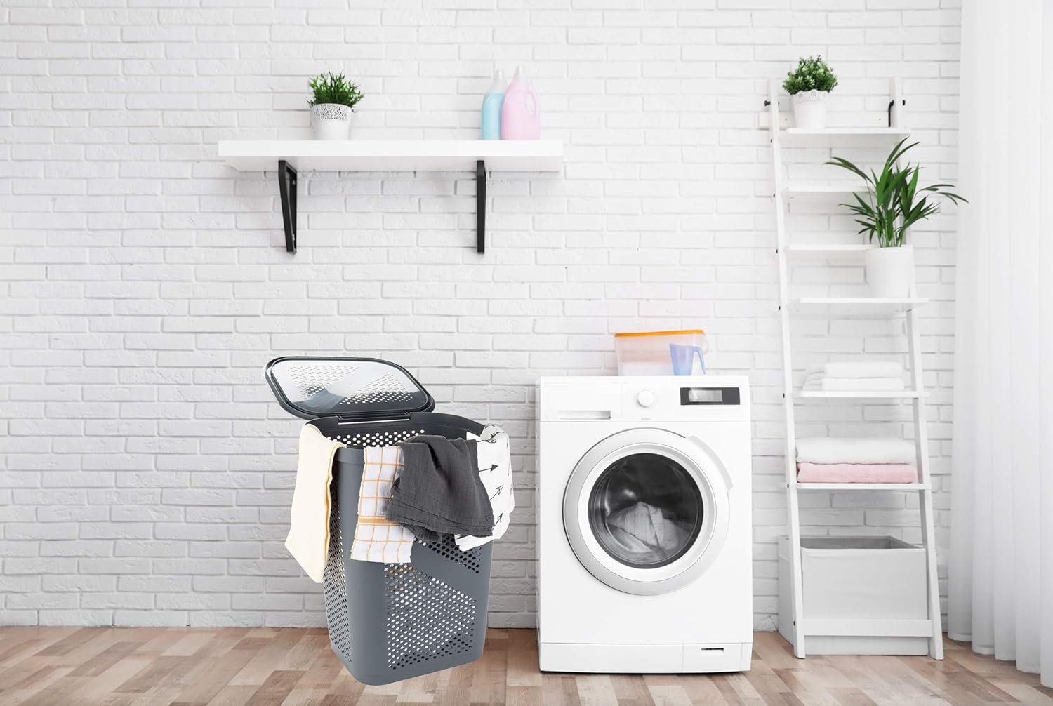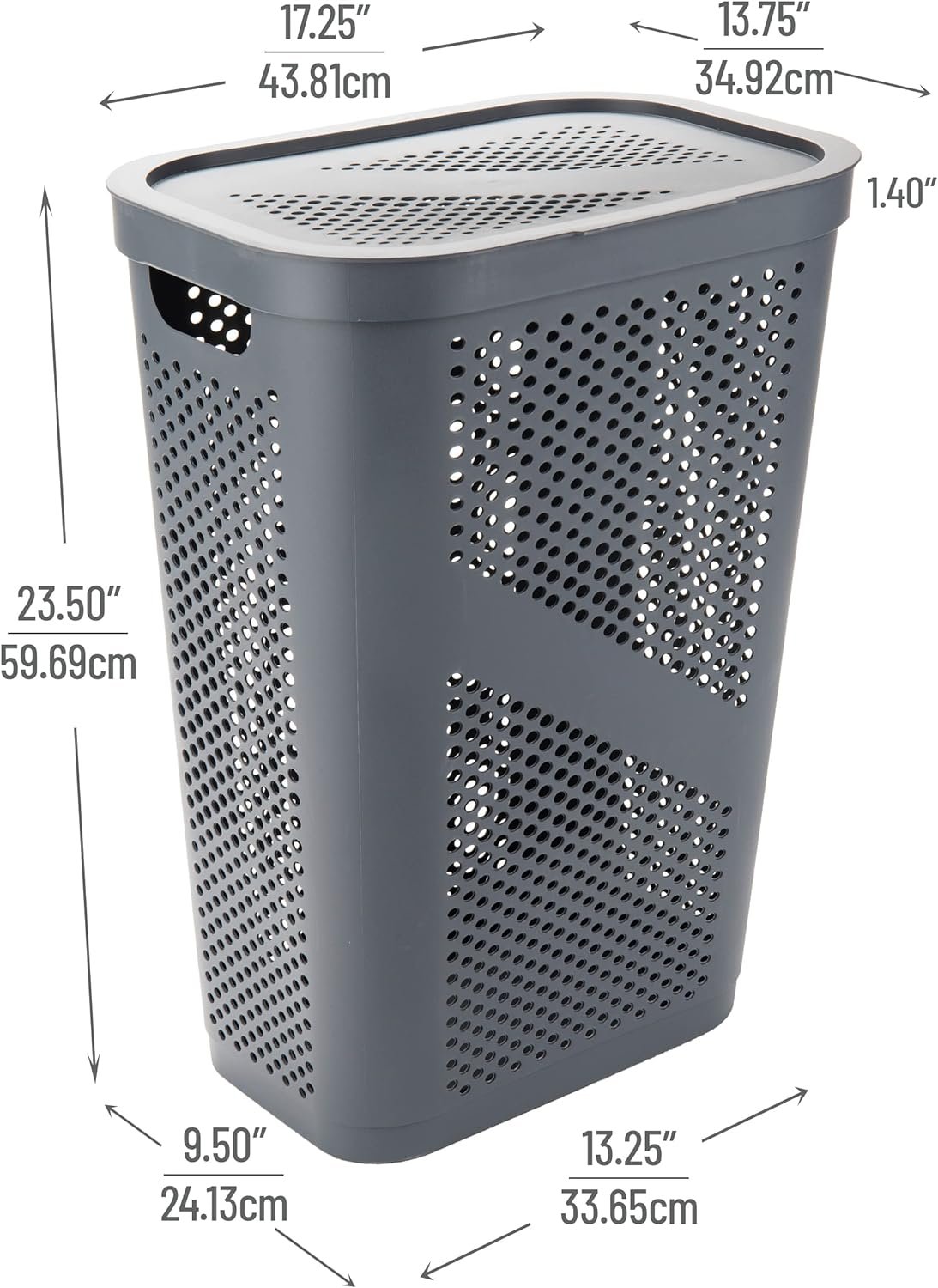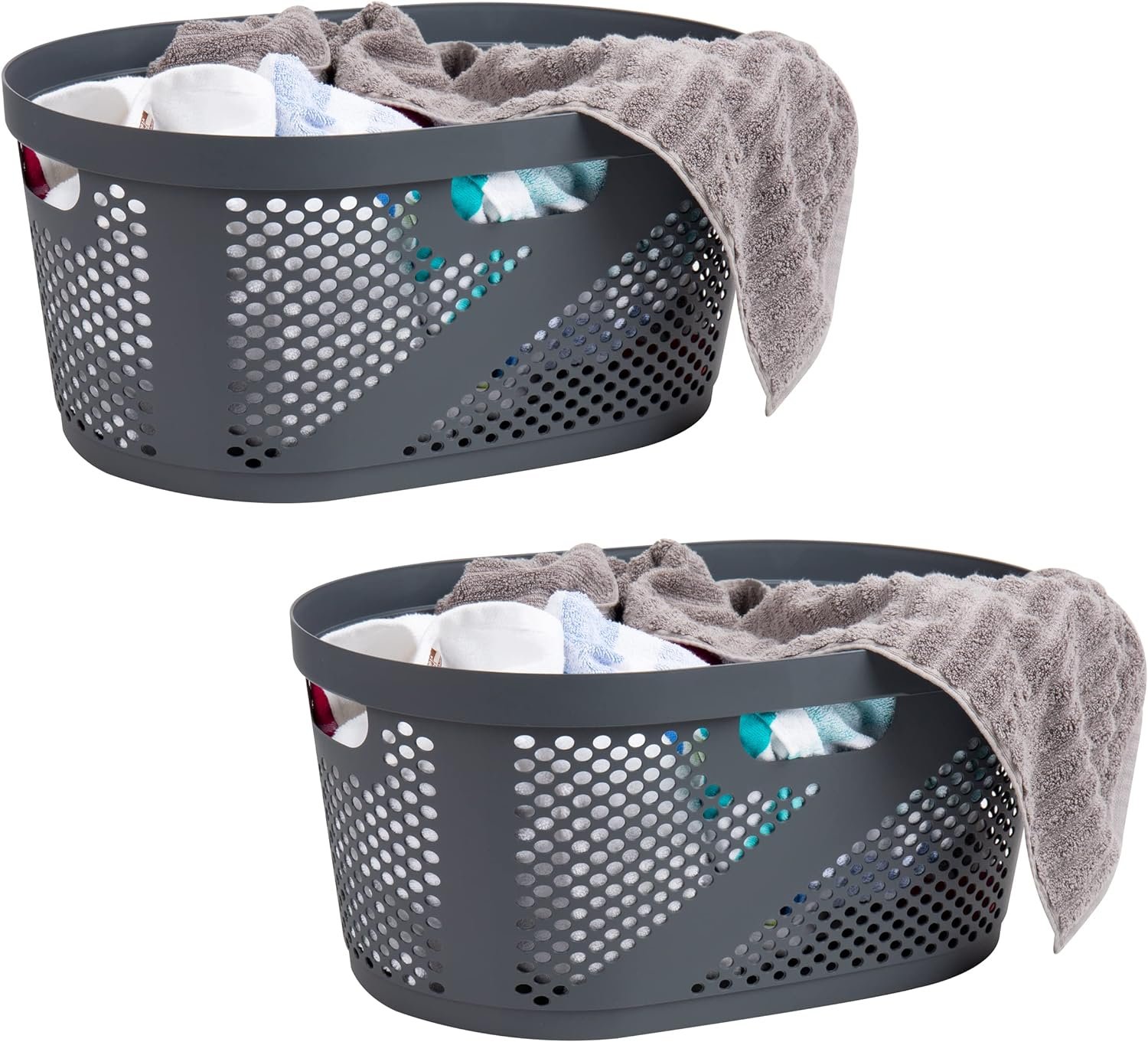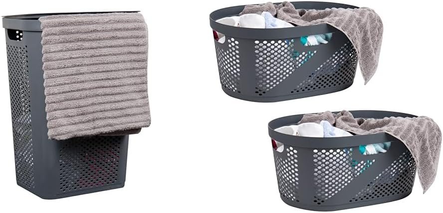 This laundry hamper bundle includes one 60 liter slim gray hamper with a hinged lid and cutout handles, as well as a set of two additional 60 liter gray hampers with lids. With convenient transportation features like handles and lids, these hampers allow you to neatly store, organize, and transport laundry. The ventilated, open grid design promotes airflow to keep laundry fresh, while the durable plastic construction reliably holds up to 15kg (33lbs) of laundry per hamper. Thanks to their slim profiles, these hampers maximize storage capacity while fitting into tight spaces like small bathrooms and closets. With ample room to hold a significant amount of laundry and linens, these hampers are ideal for managing laundry needs in an organized fashion. Their similar capacities, sizes, and designs allow the hampers to seamlessly complement each other for a cohesive storage solution. Whether using the hampers side by side to transport laundry, or storing them together in a laundry room, mudroom, or closet, this bundle offers versatile laundry organization.