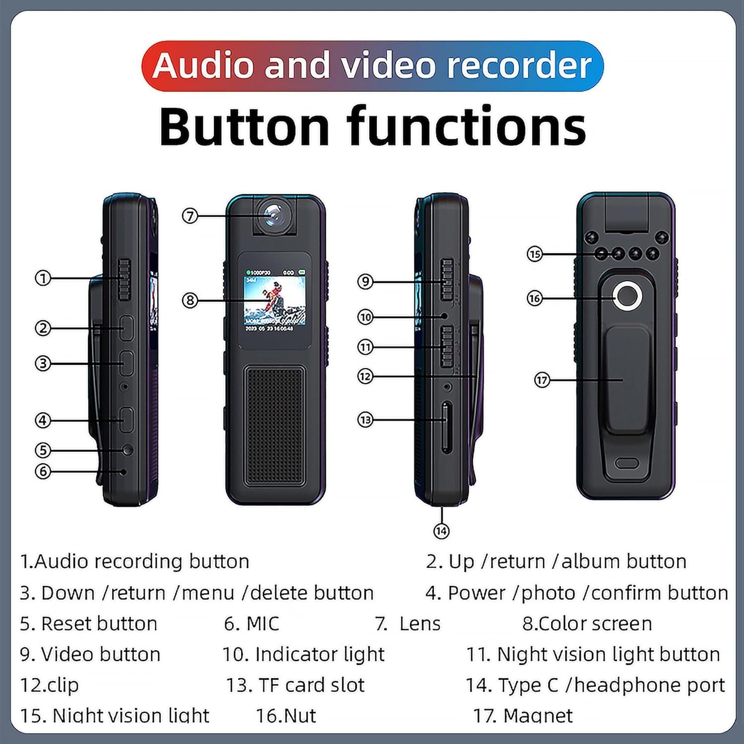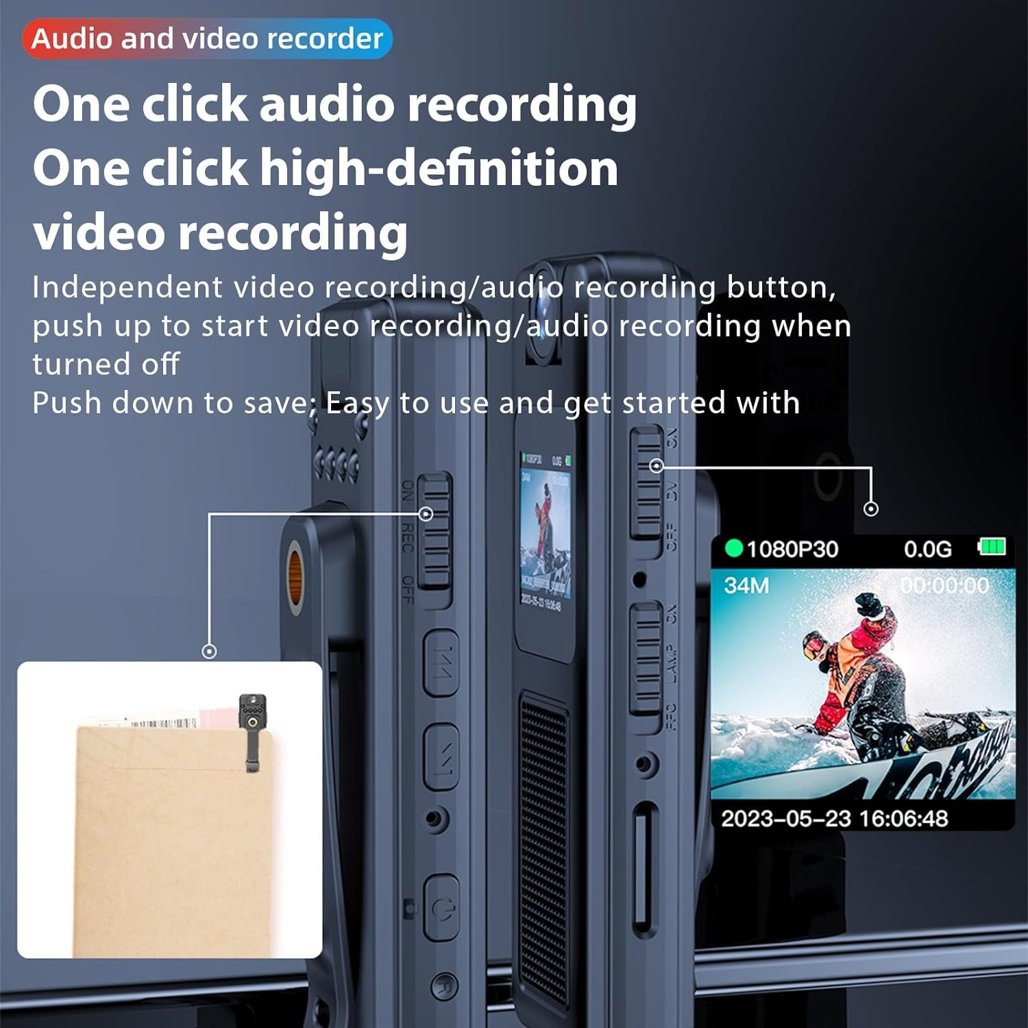 [0.85 – Inch Screen & Detailed menu] — One-click audio recording One-click high-definition video recording: Independent video recording/audio recording button. Easy to use and get started with. With a 0.85-inch screen, it can watch and record at the same time. Convenient for your footage to replay & delete instantly. Provided a Detailed menu for you to use. Offering inverted screen switching mode & power display, Max 30-minute loop recording. Loop recording supports up to 256GB.