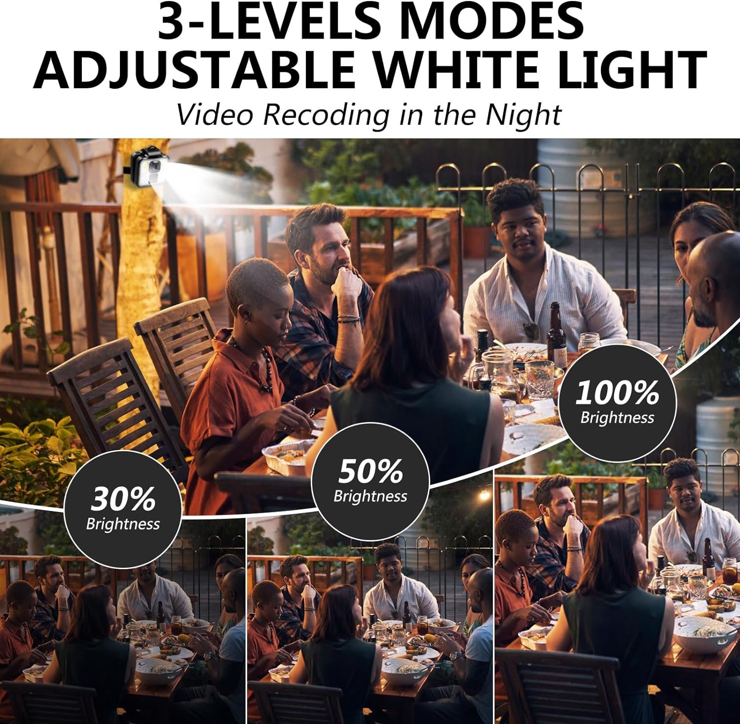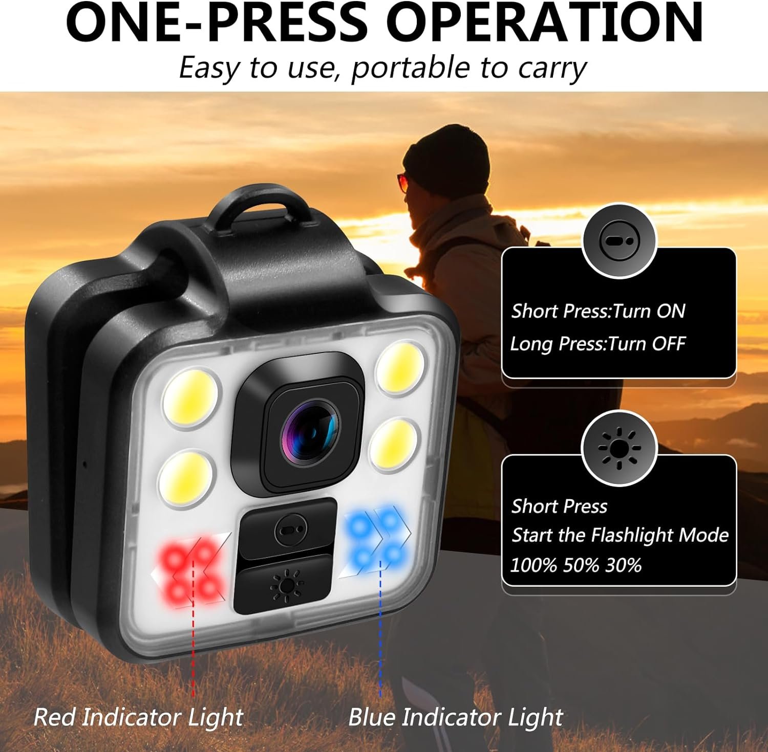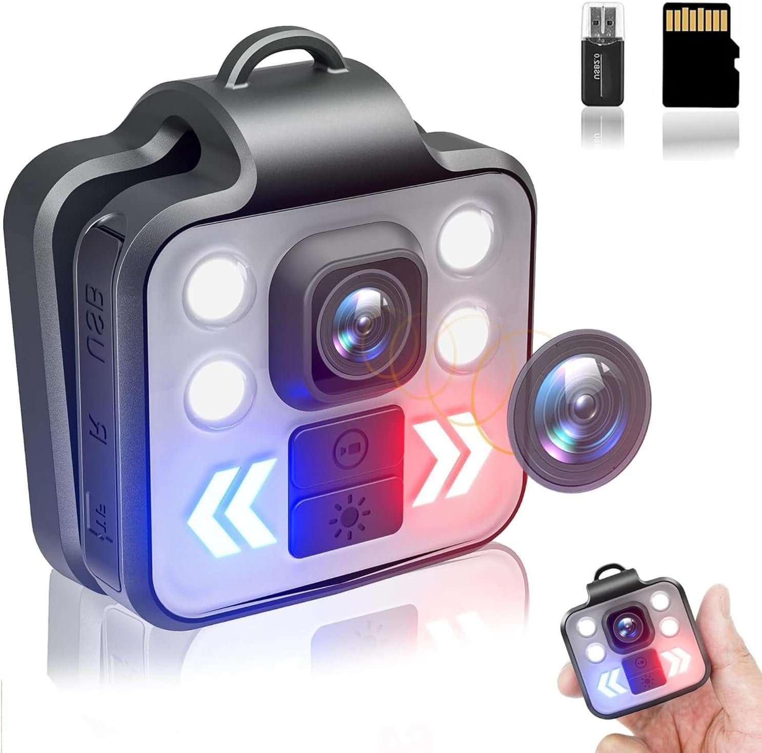 Adjustable LED Light: Hidden portable headlight flashlight body camera with four high-power white lights, adjustable in three modes (30%-50%-100% brightness), easy carriable pocket cam that light your surroundings at any time.