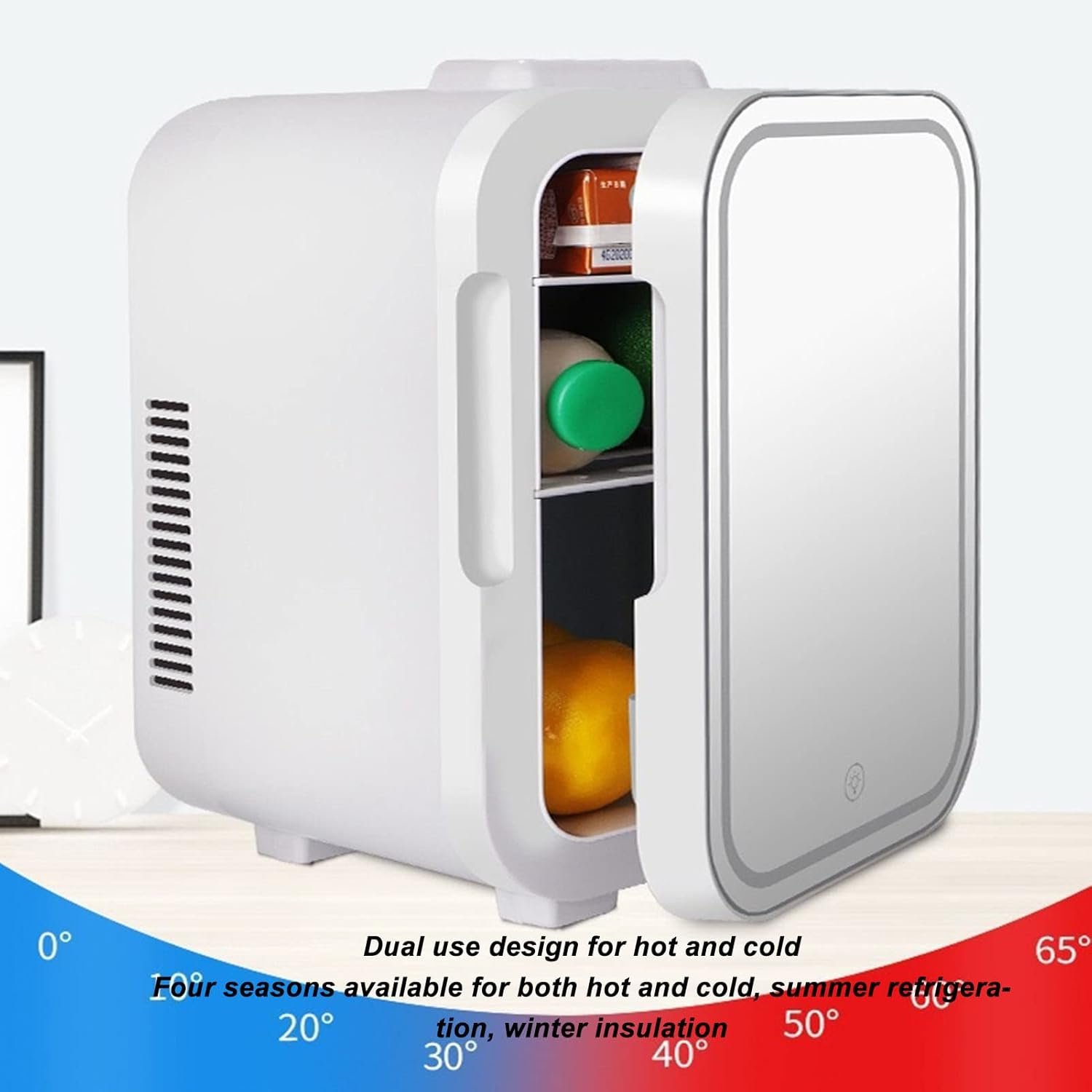 COLD AND HOT DUAL USE: Refrigeration minimum 0‑2 °C, can refrigerate cosmetics, milk, drinks, fruits, vegetables, etc. Heating up to 65 °C, can be heated mask, milk, bento, sandwiches, etc.