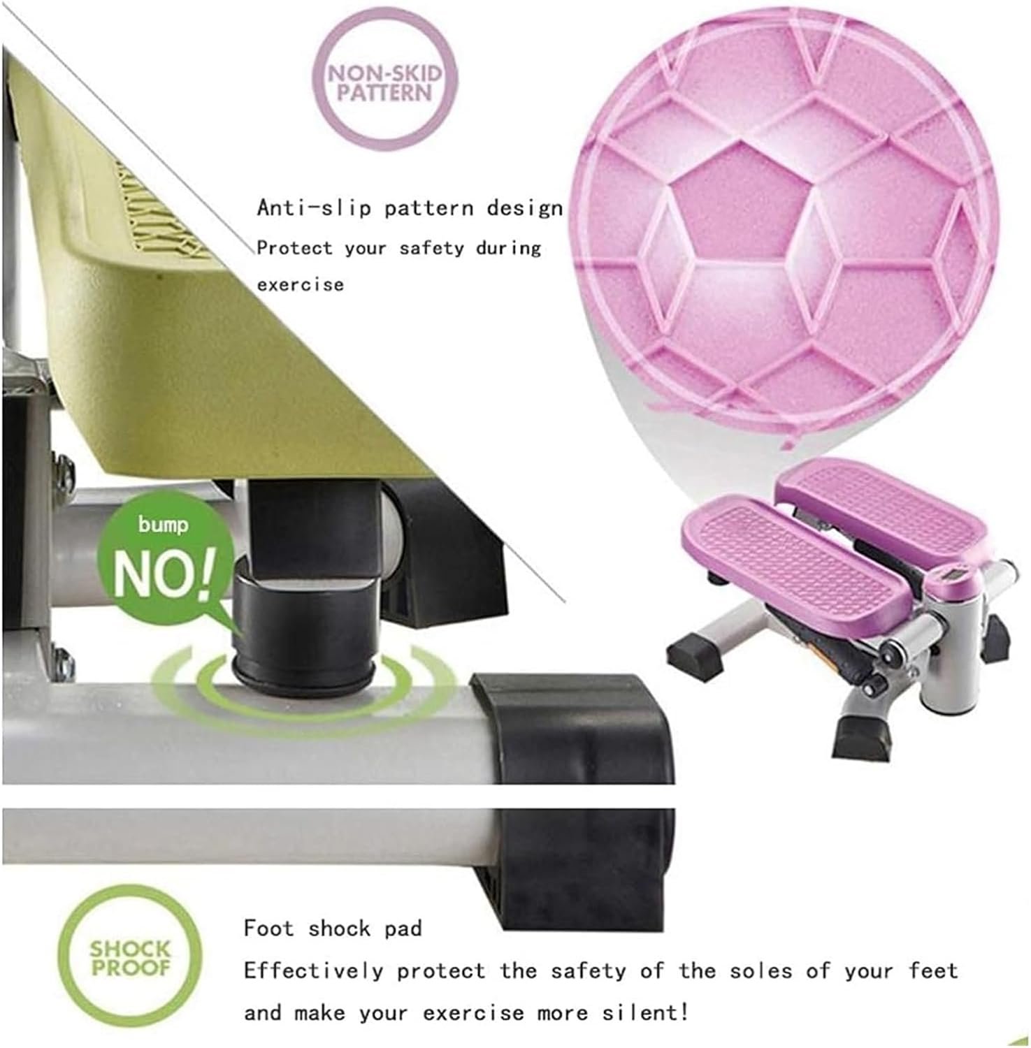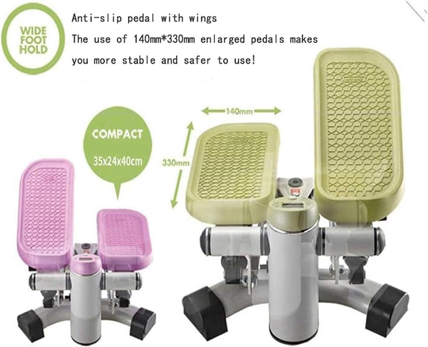 **Non-Slip Wide PVC Pedals:**The mini stepper features large, textured, non-slip foot pedals along with skid-resistant floor protectors to ensure user safety. With a maximum user weight capacity of up to 220 lbs, it provides a secure platform for workouts.