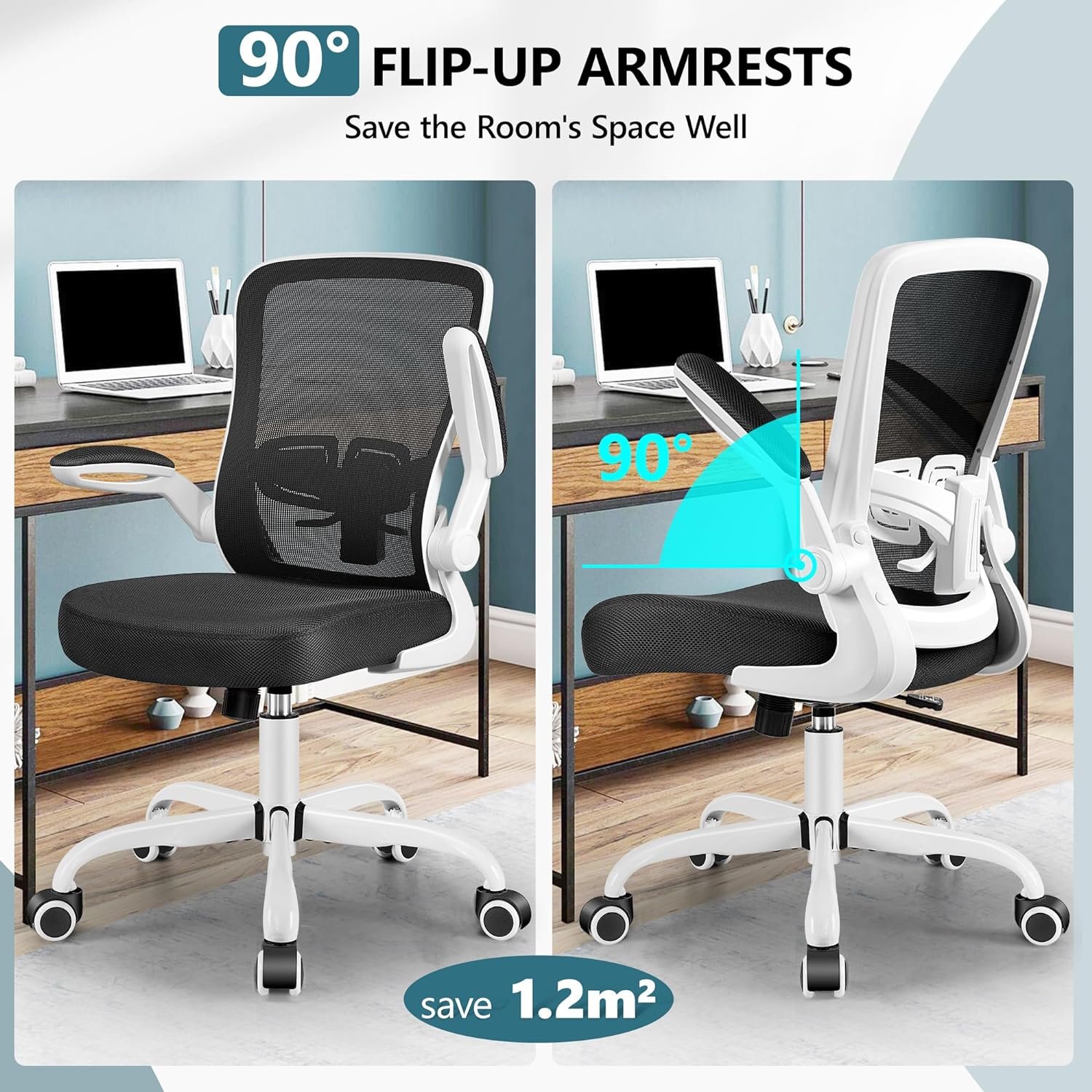 【Multiple Adjustable User Friendly Functions】Our ergo office chair with 3.94 inches (10cm) adjustable height, and swivels 360° on very smooth wheels. The 90° flip-up armrests with thick sponge can be lifted up at any time to place the chair under the desk, saving space in your bedroom. Maximum weight capacity is 300 lbs.