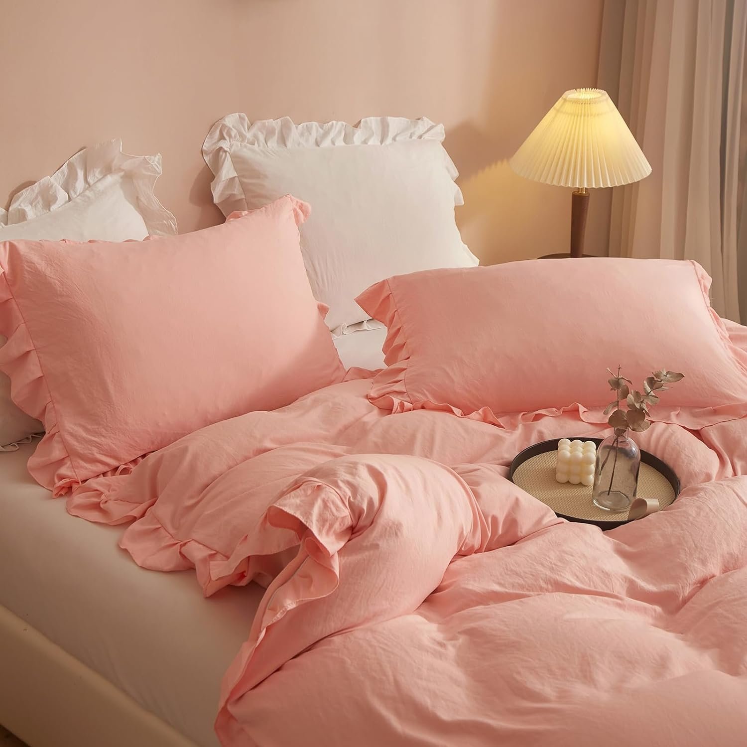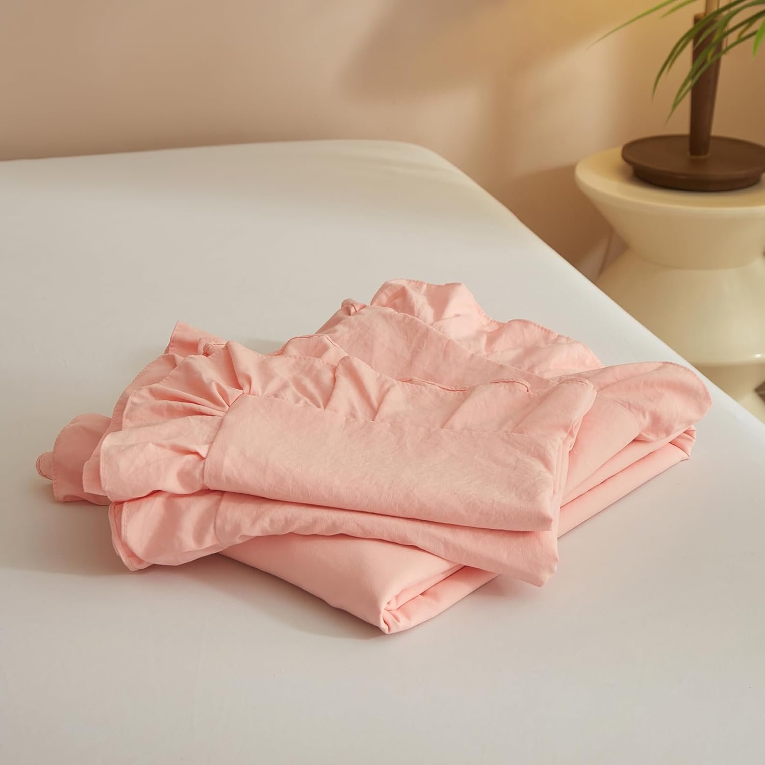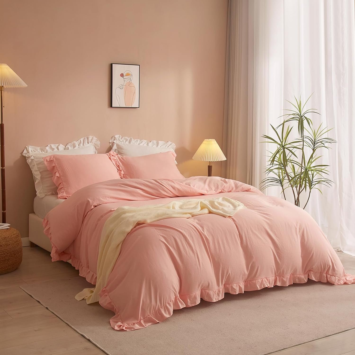★【Size Information】–1 blush pink ruffled duvet cover 90×90 inch, 2 matching pillowcases 20×26 inch.