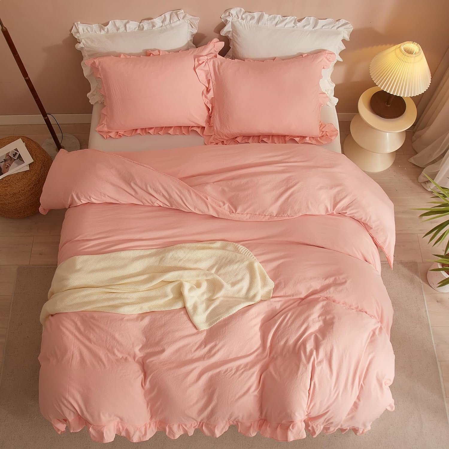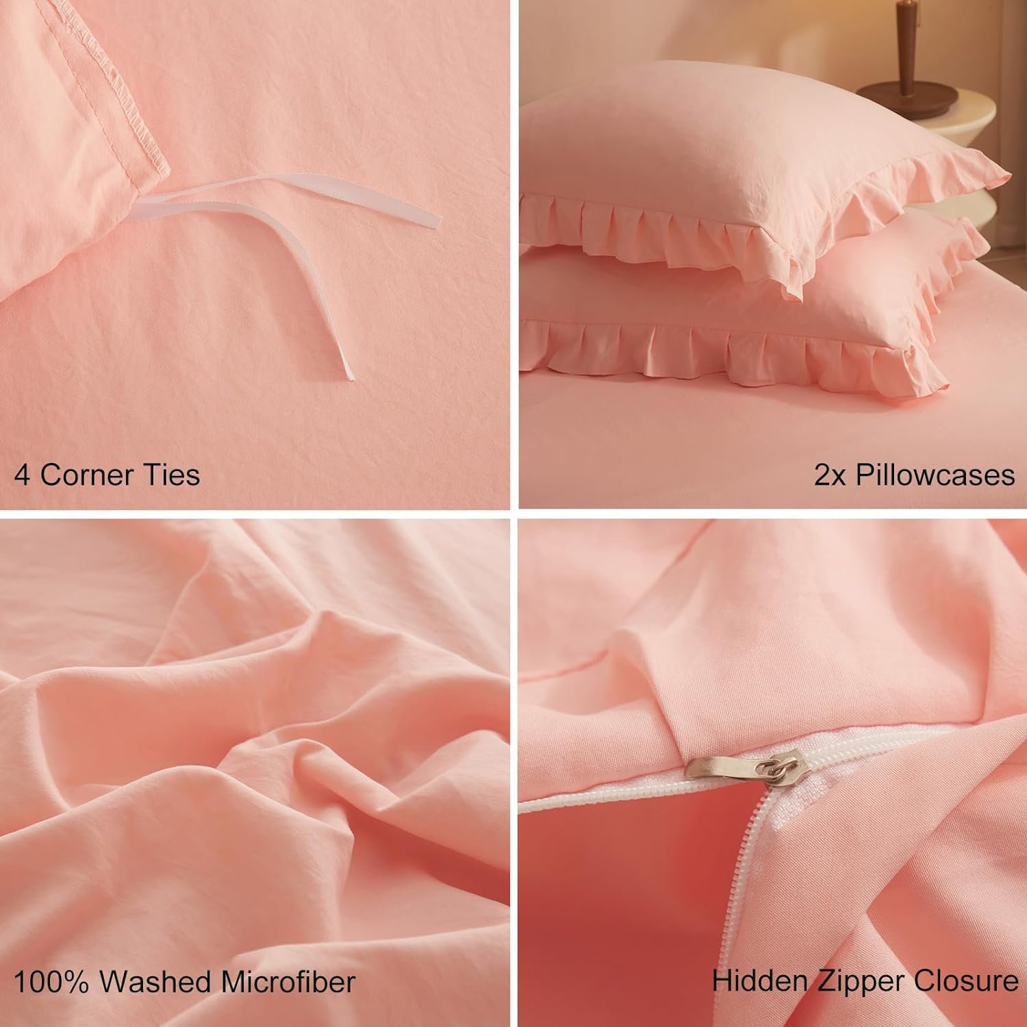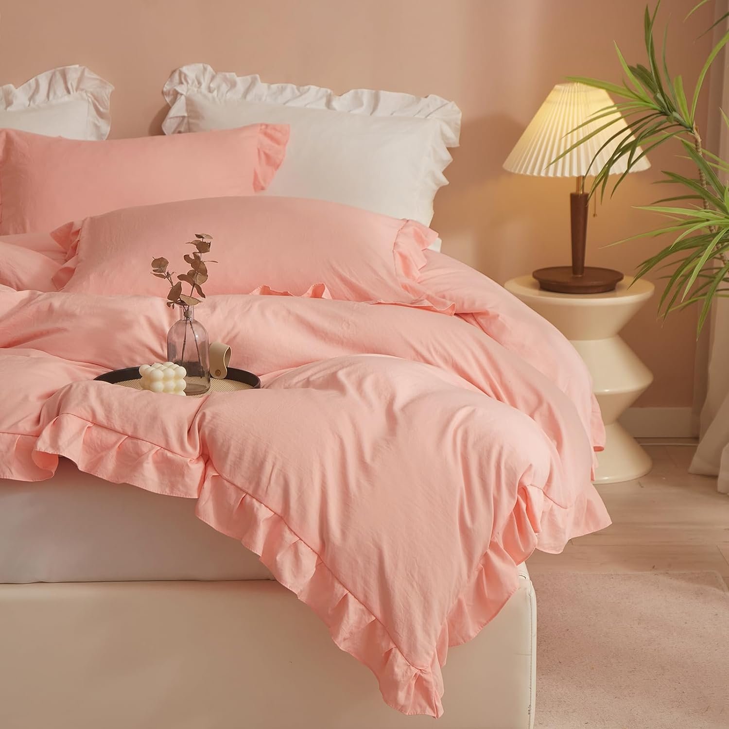 ★【Size Information】–1 blush pink ruffled duvet cover 90×90 inch, 2 matching pillowcases 20×26 inch.
