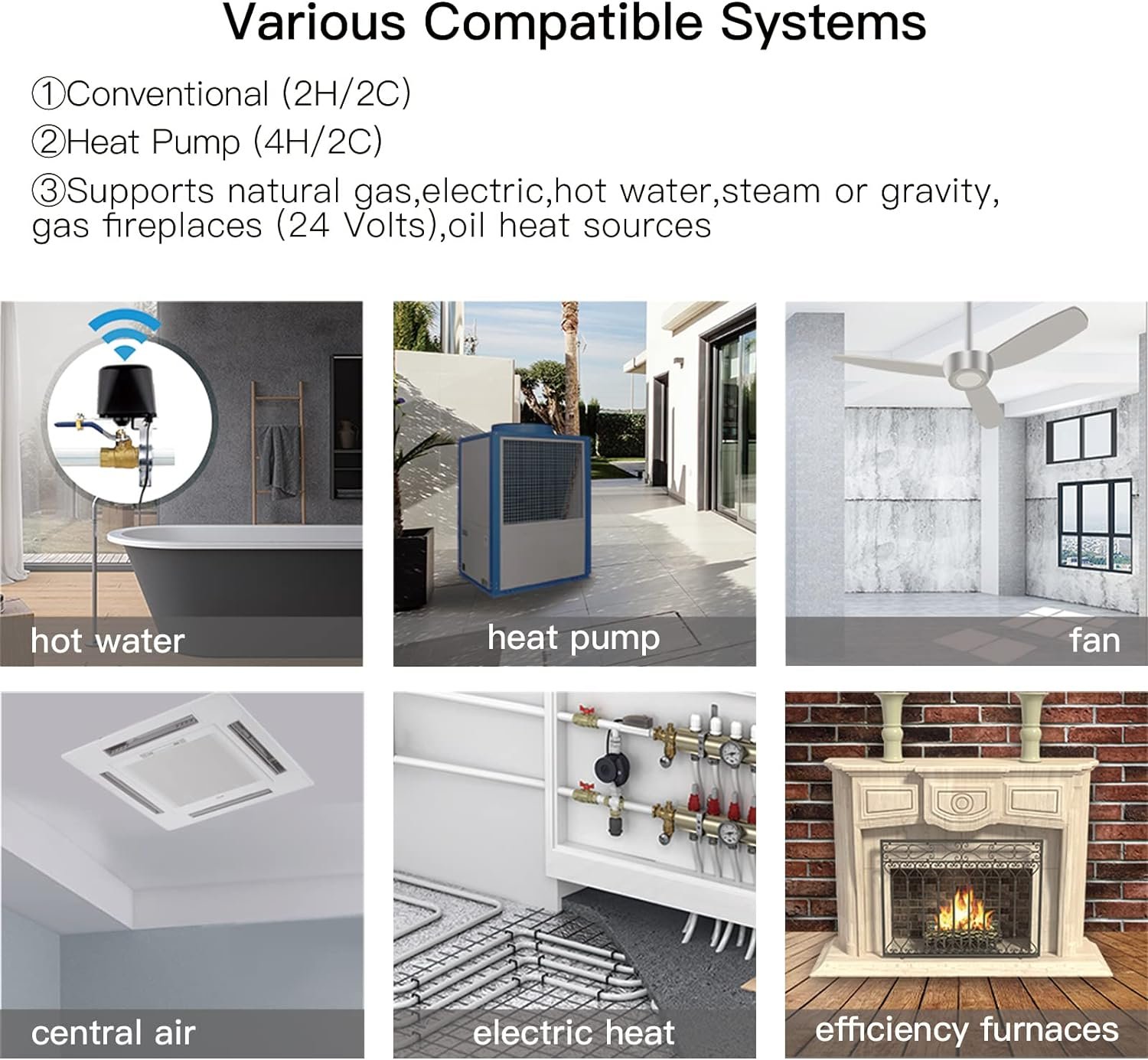 【Various Compatible Systems】Conventional (2H/2C); Heat Pump (4H/2C); Supports natural gas, electric, hot water, steam or gravity, gas fireplaces (24 Volts), oil heat sources.