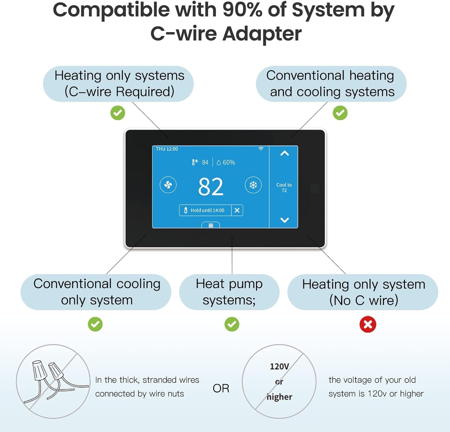 【Wide compatibility with C-wire adapter/Not supported 2 wire】Suitable for Conventional (2H/2C); Heat Pump (4H/2C); Not support heating only systems(No C-wire)/high voltage systems(120V-240V)