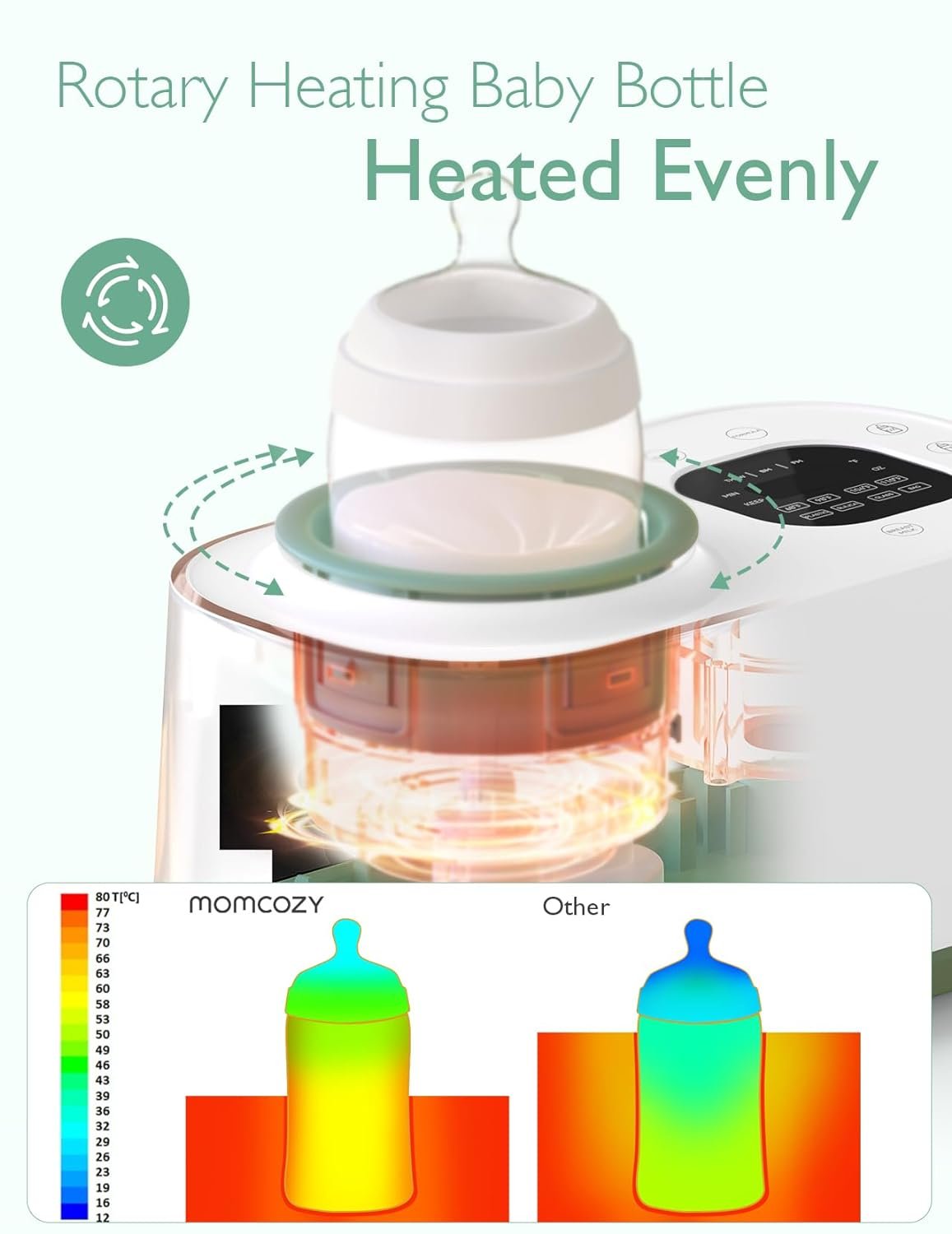 Rotating Heating: The Momcozy waterless bottle warmer is the first on the market to shaking warm milk. It simulates the shaking of a baby bottle, avoiding milk clumps and safely heating breast milk to the ideal temperature.