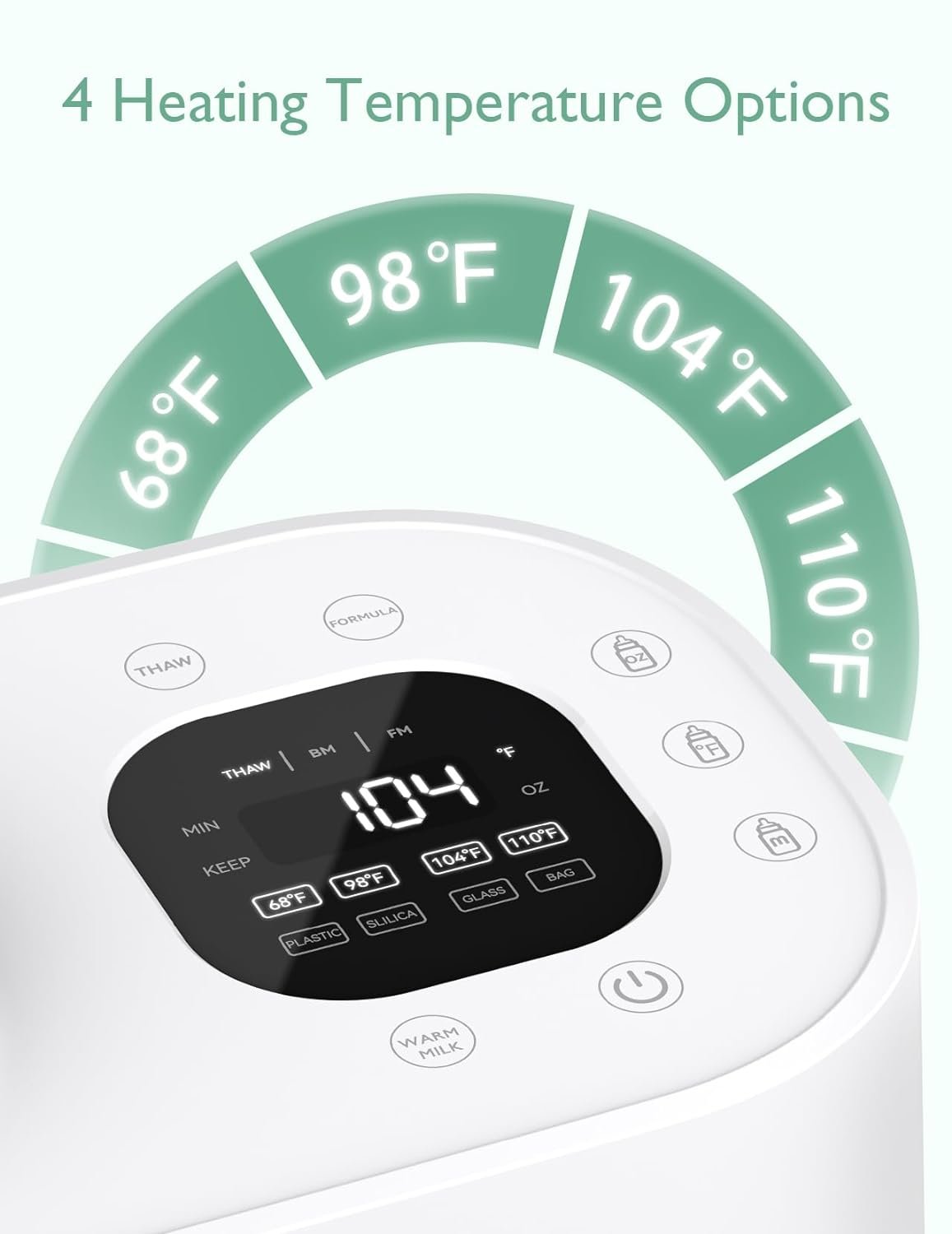 Four Temperature Settings: Our bottle warmer does not have the traditional default temperature setting. It offers 4 temperature options (68℉, 98℉, 104℉, 110℉), tailored to different needs.