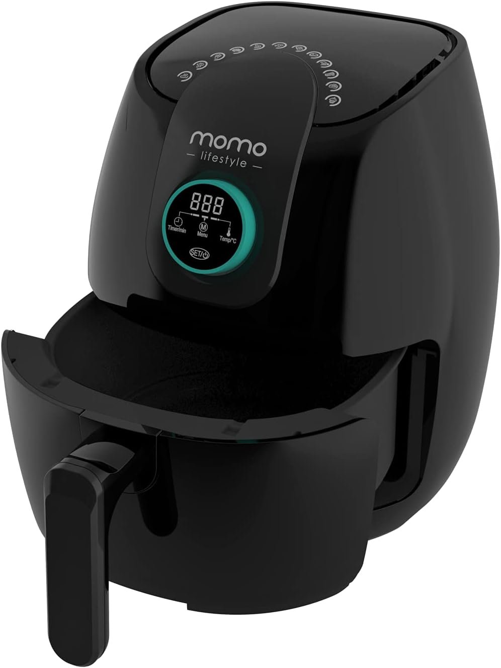 Momo Lifestyle Small Air Fryer 3.4 QT Ceramic Coated Teflon Free Compact Air Fryer 12 Preset Functions with One Touch Digital Wheel 1500W Dehydrate Defrost and Reheat Functions Dishwasher Safe (Black Caviar)