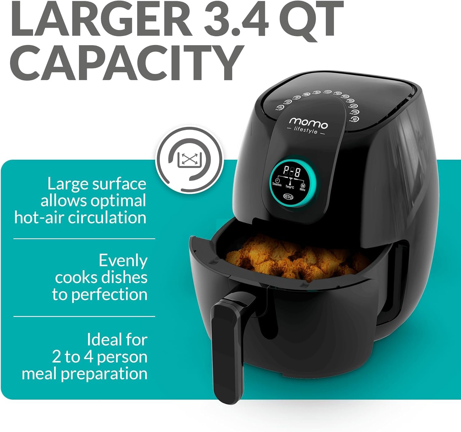 1500W ETL CERTIFIED: 3.4 QT surface with quickflow optimal air circulation! A 1500W ETL certified mini air fryer with the comfort and reliability of a 1 year warranty provided by Momo Lifestyle.