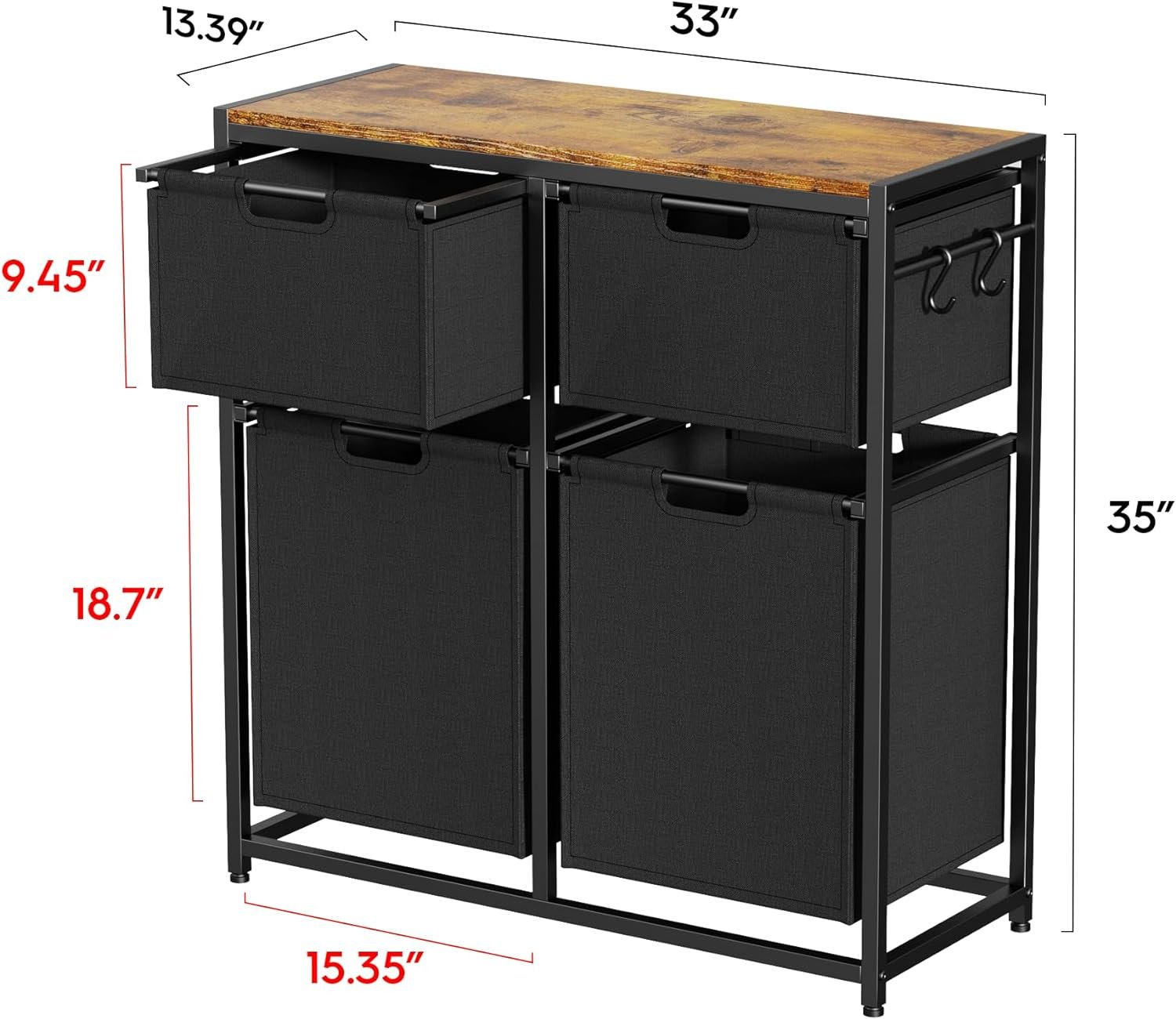 The upper tier features two small bags (8.4 gallons/31.83 liters each) The lower tier includes two large bags (16.64 gallons/63 liters each)Our Laundry Hamper is designed with four adjustable feet at the bottom, ensuring stability on any surface.Our Laundry Hamper is equipped with four S-shaped hooks, providing a convenient hanging solution. Use these hooks to hang smaller items such as delicates, towels, hats, or small gardening tools.