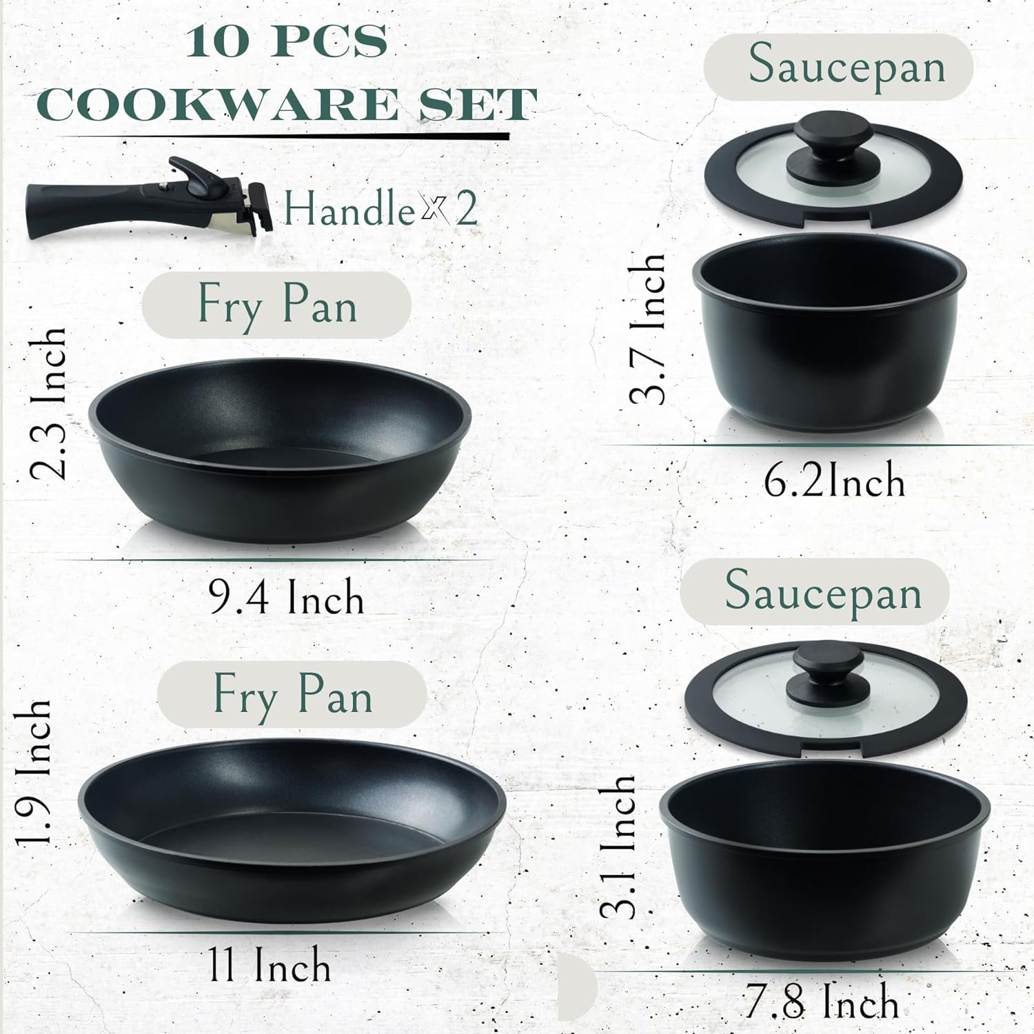 Kitchen Pots And Pans Set: The nonstick pots and pans set includes a saucepan 6.2″, a large pot 7.8″, fry pan 9.4″, a large fry pan 11″, 2 silicone rim’s glass lid, detachable handle x 2, 1 glove, and a silicone mat. It is precisely the kitchen cooking set you need for your day-to-day cooking and camping, as camper cookware or as cookware for travel trailers!