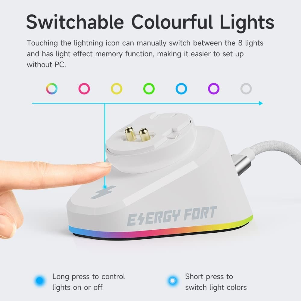 ⚡【Impressive Gaming Experience】The Wireless Mouse Charger Station is equipped with the latest RGB lighting effects, and the beautiful LED lighting effects enhance the gaming atmosphere and allow you to enjoy the game more. Using full-color LEDs, you can change the digital color of 16 million colors. Switch freely between 7 cool display modes with one button and RGB lighting echoes the lighting variations of the Razer mouse, creating an excellent GAMING ROOM.