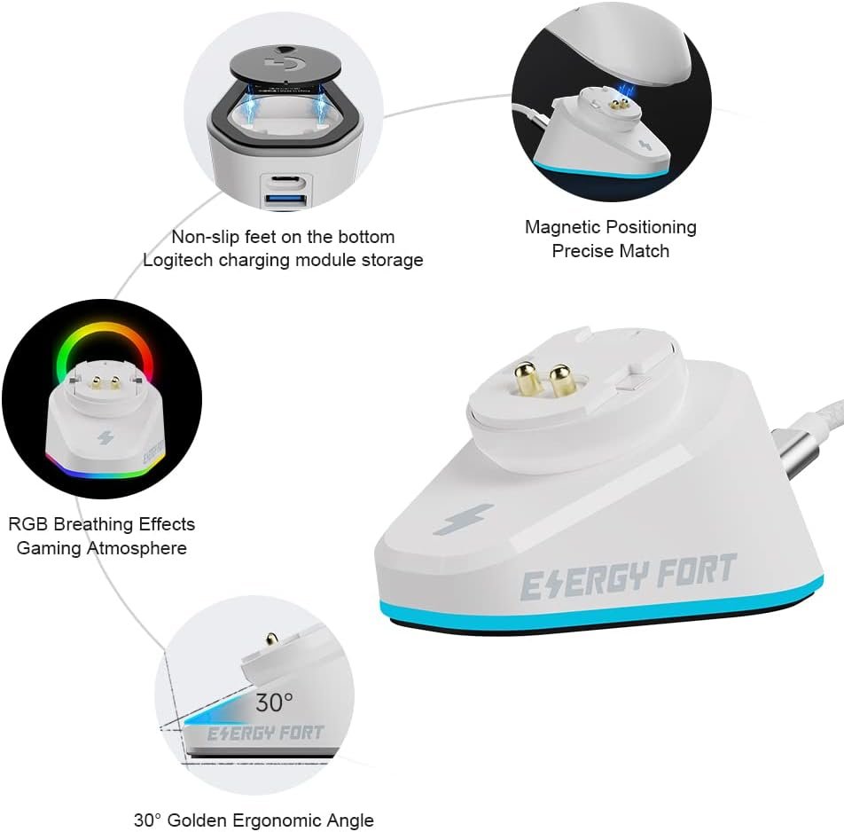⚡【Mouse Charging Station for Logitech & Razer Mice】Mouse Charging Station is specially designed for Logitech and Razer Mice. Simply place the Logitech mouse on the dock, ready to charge and always ready to engage in gaming battles. RGB lighting and USB3.0&2.0 docking station for connecting USB flash drive, 2.4G receiver, etc. Maximize the desktop aesthetics and practicality, providing you with immersive gaming experience.