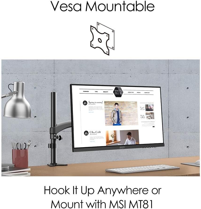 【VESA Mountable】:VESA Mountable With VESA Mountable design, you can hang your screen on the wall anywhere in your house and can also mount with MSI MT81.The MSI PRO MP241 Series supports the standard VESA-mount. You can mount the Cubi Series to its back and make the PC completely invisible from your table.