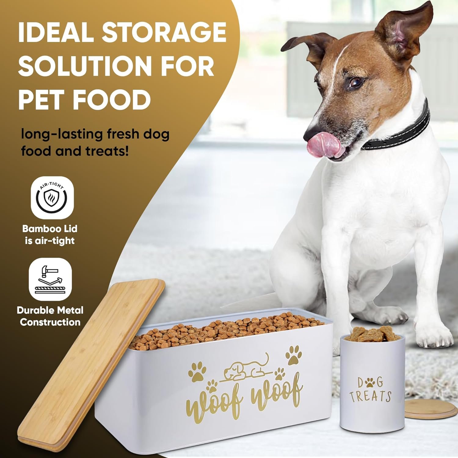Metal Dog Food Container plus Dog Treat Bin Value Set- Dry Dog Food Pet Storage Food Container Box with Bamboo Lid (White)