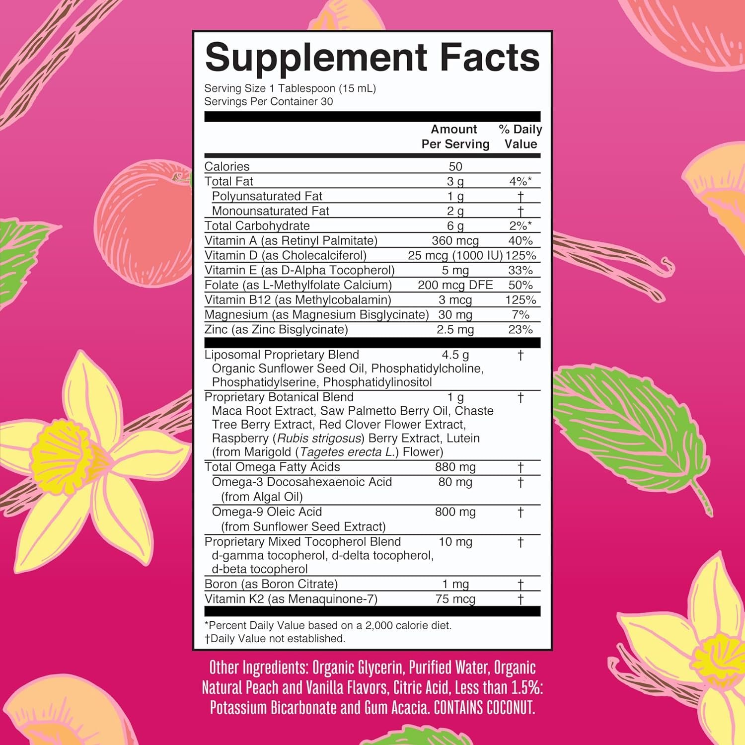 Liquid Multivitamin for Women: Methyl B12 supports energy levels and aids in amino acid metabolism, while methylfolate (vitamin B9) helps the formation of red and white blood cells, cell growth, and proper cell division. Omega-3 as DHA and omega-9 support cognitive health, cardiovascular health, and immune health.