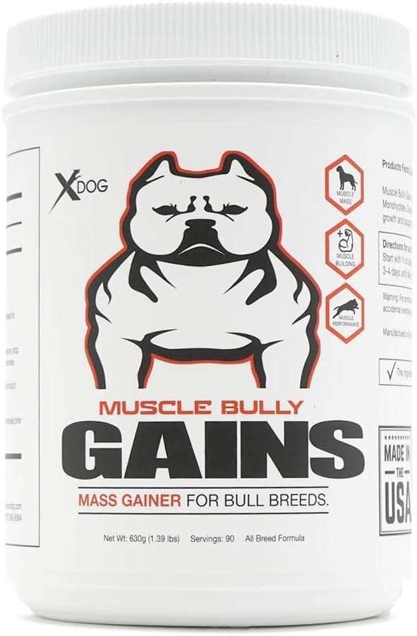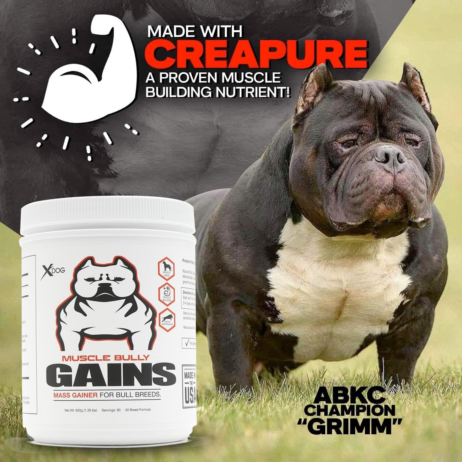 WANT TO ADD MASS FAST ON YOUR SKINNY BULLY? Muscle Bully GAINS is a powerful, Healthy and Effective Nutritional supplement that is designed to help skinny, scrawny dogs pack on HEALTHY MASS. This exceptional formula combines specific ingredients and nutrients such as Muscle Building Creapure with High Quality Protein and Healthy Fats that help ADD WEIGHT on your dog the right way!