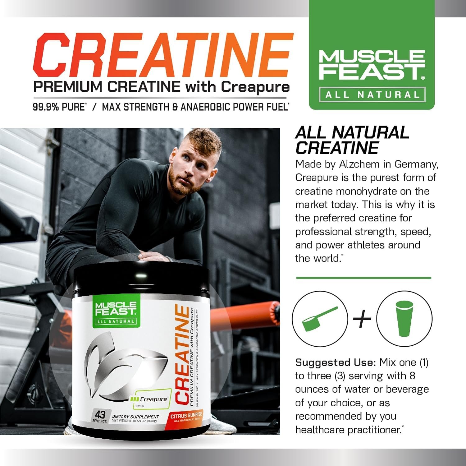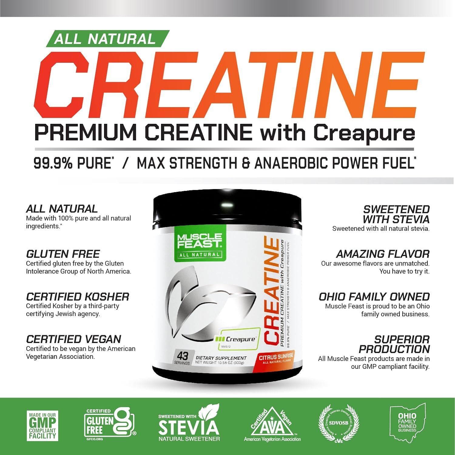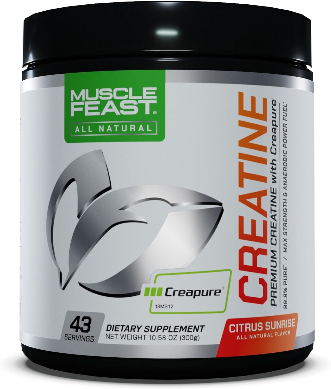 Muscle Feast Creapure Creatine Monohydrate Powder, Vegan Keto Gluten-Free, All Natural No Artificial Ingredients, Citrus Sunrise, 300g