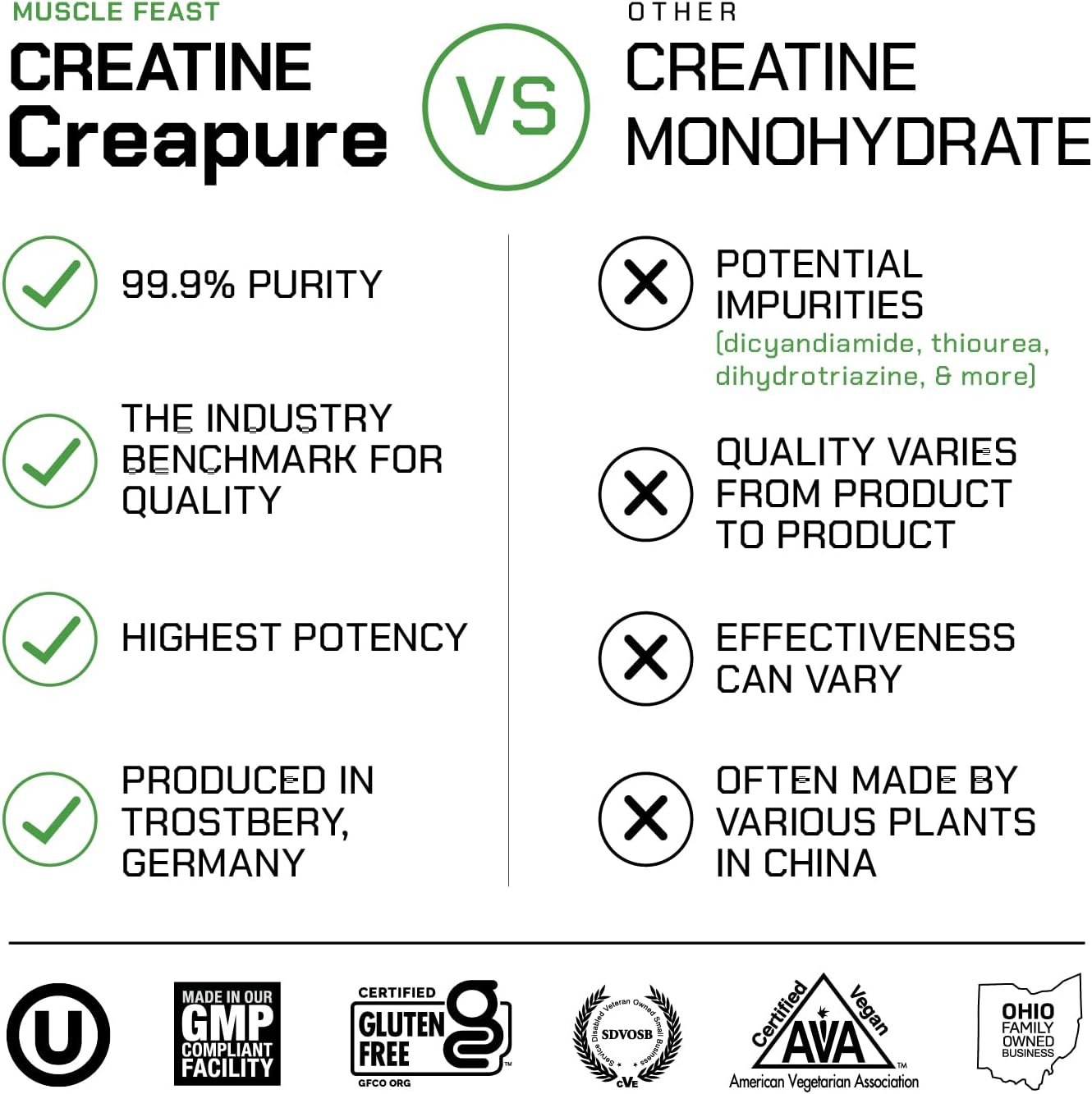99.9% PURE: Creapure is a vegan creatine monohydrate that contains only pure creatine and no other ingredients; gluten-free and certified OU Kosher. 43 Servings (5g of Premium 100% Pure German Creatine Per Serving)