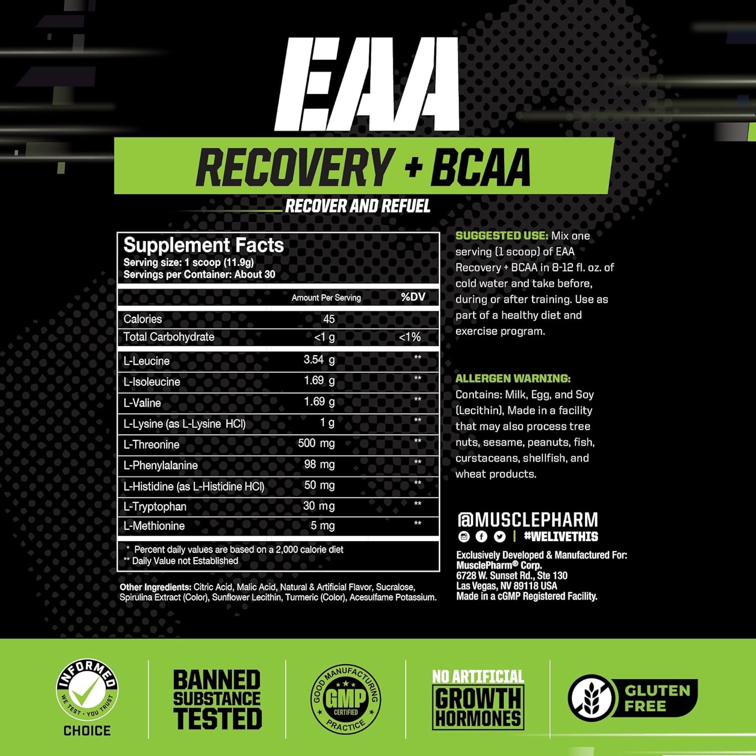 Enhanced Muscle Recovery & Performance: MusclePharm EAA Recovery + BCAA helps minimize muscle damage and support lean body mass by delivering a healthy dose of all nine essential amino acids including BCAAs.