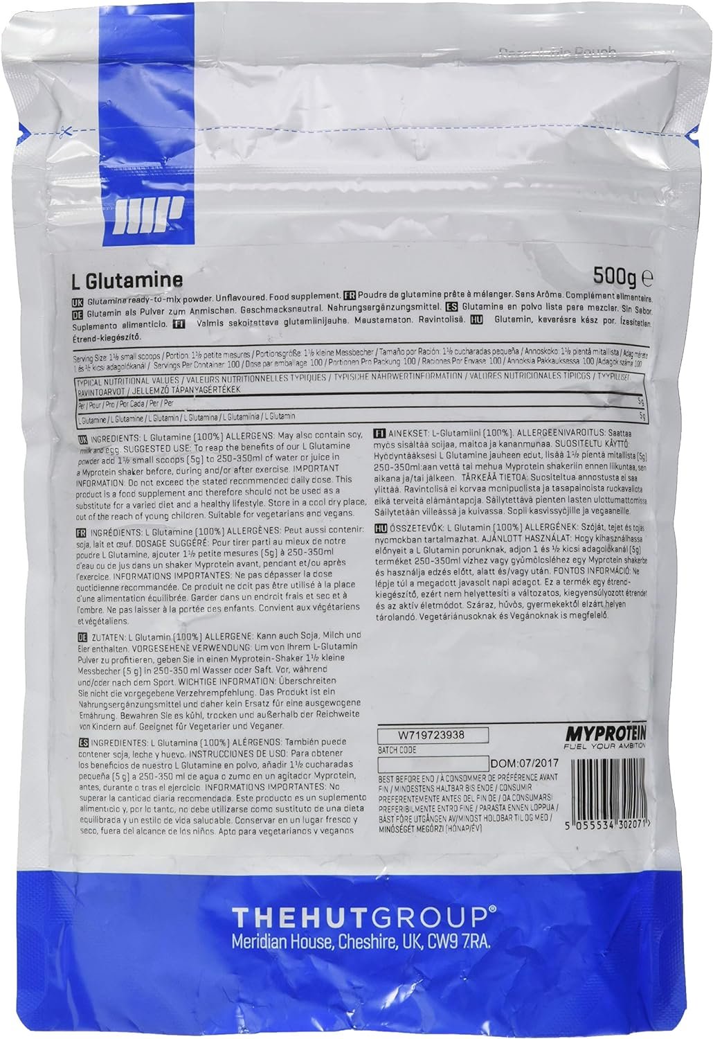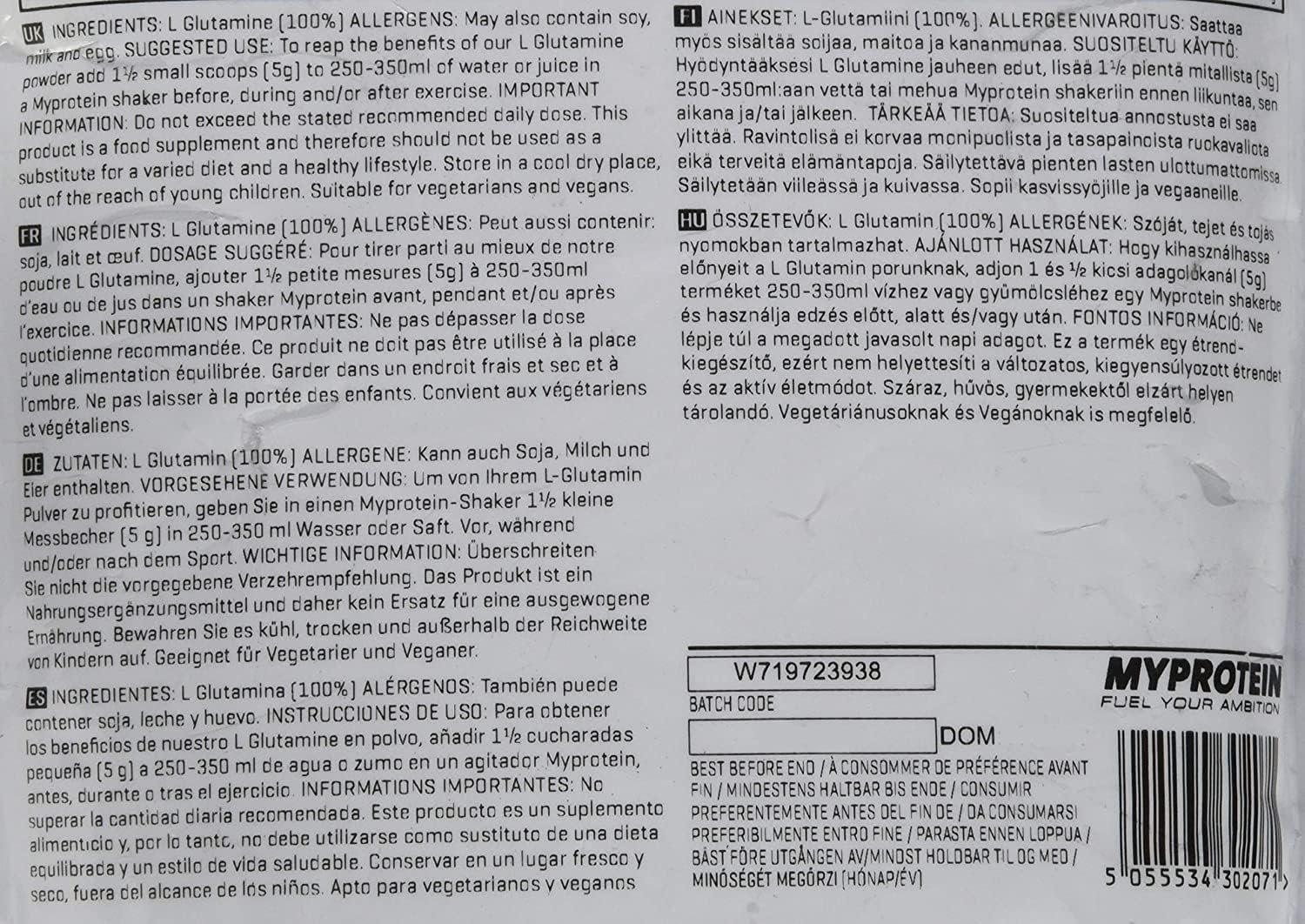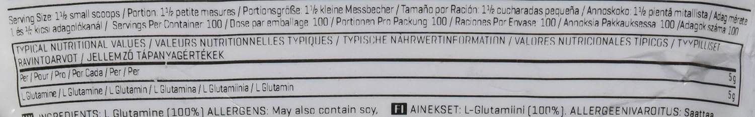 Container Size: 1kg Serving Size: 1 1/2 Scoop (5g) Amount Per Serving: Protein: Carbohydrates: Fat: Salt: Ingredients: L Glutamine (100%) Please Note: Nutritional facts and ingredients may vary slightly between flavors.