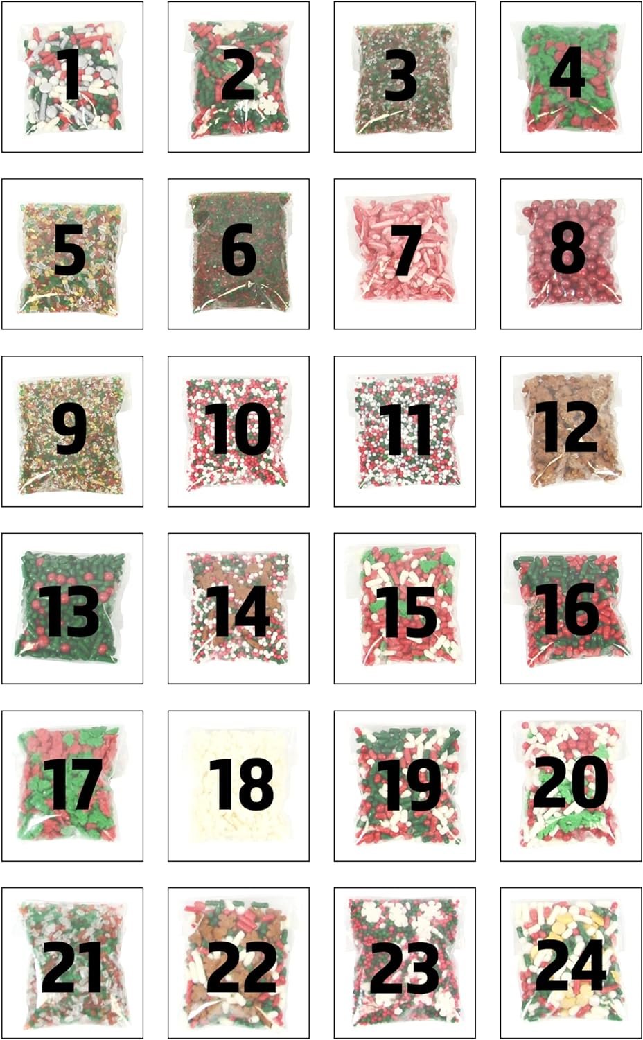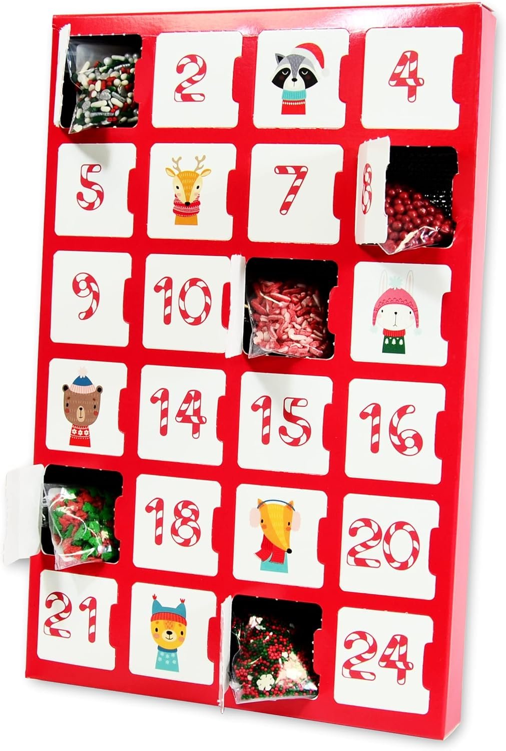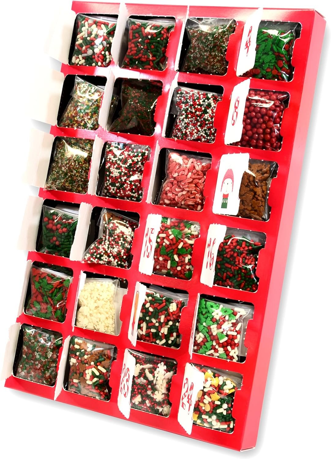 Each night, your recipient opens the door corresponding to the number day and receives 1.5 teaspoons of delightful and delicious Holiday themed dessert toppings. Included are: sprinkles, nonpareils, edible confetti, & sugars. A standard serving size of dessert topping is 1 teaspoon, giving this calendar just a little bit of extra sweetness for your extra sweet little one!