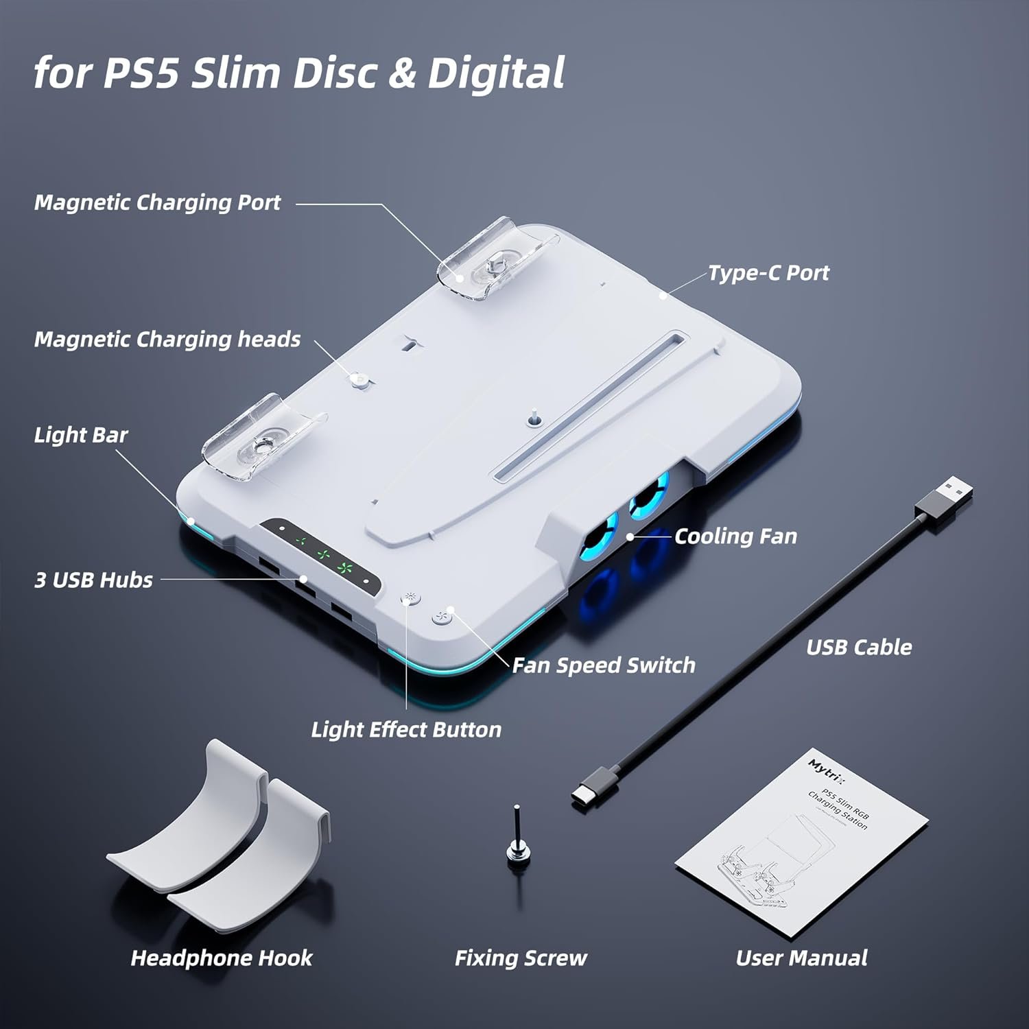 Mytrix PS5 Slim Stand and Cooling Station with Dual Controller Charging Station for Playstation 5 Slim Console, Controller Charger, 3 Speeds Cooling Fan, Headset Holder, RGB Lights & 3 USB Ports
